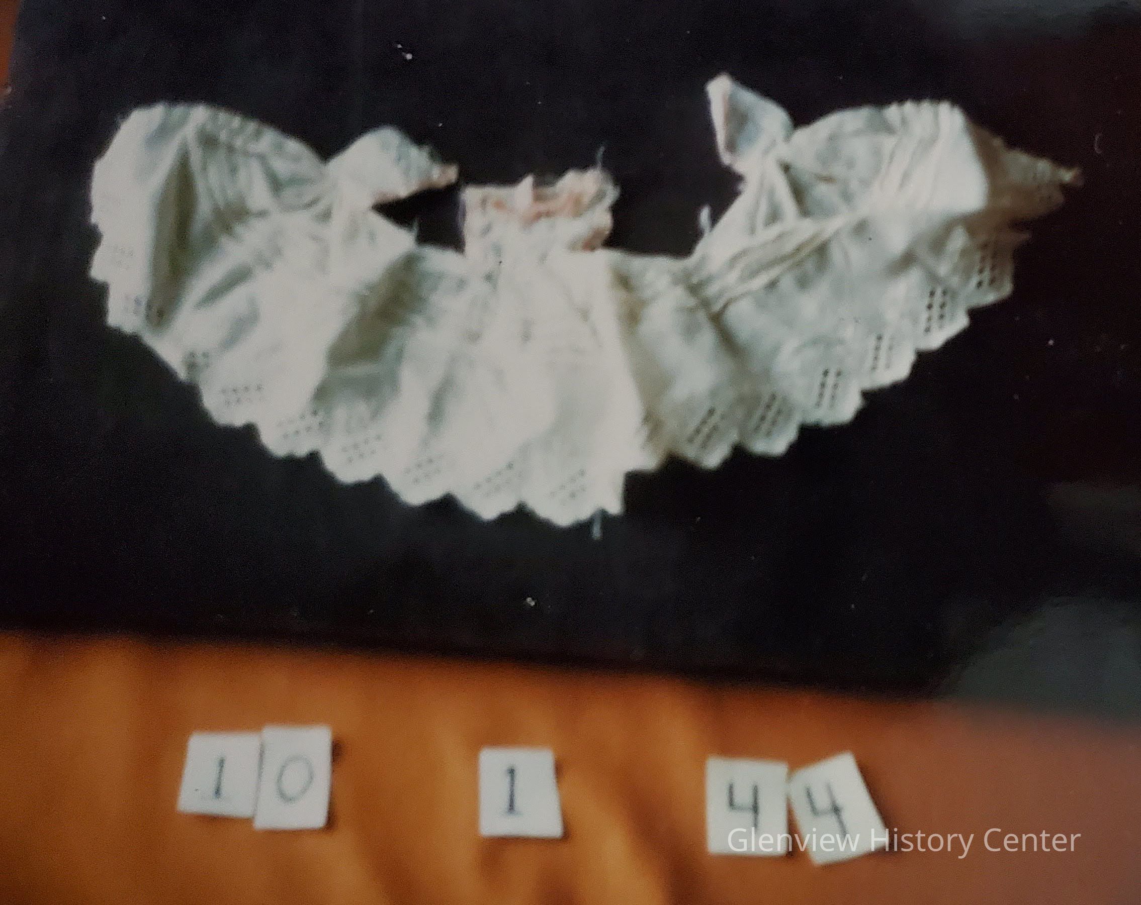 Cotton batiste white doll pinafore with applied pink ribbon trim; eyelet cut-out on bib and hem.