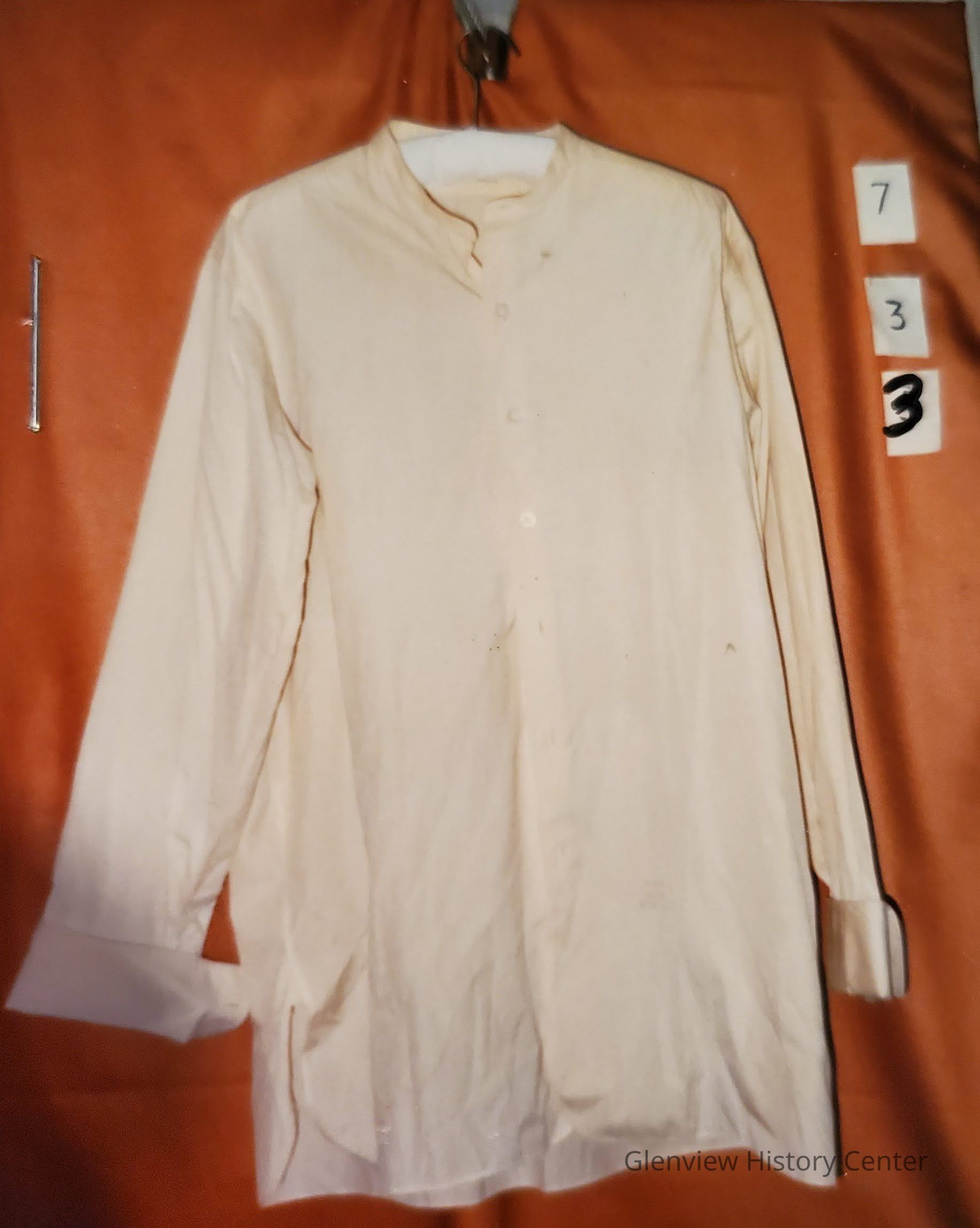 Cream color cotton shirt with 1/2" stand-up collar, long sleeve, french cuff with 2 button holes.