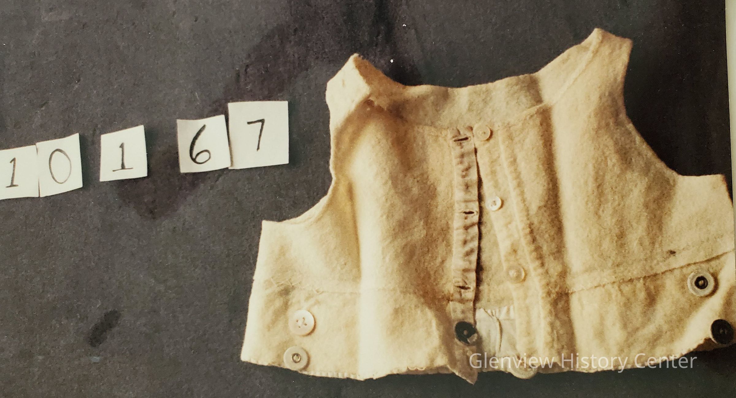 Underskirt bodice with buttons at base - bodice top designed to attach to pants or petticoat - T-Shirt style. Buttons around bottom edge; center front closure; feather stitching.