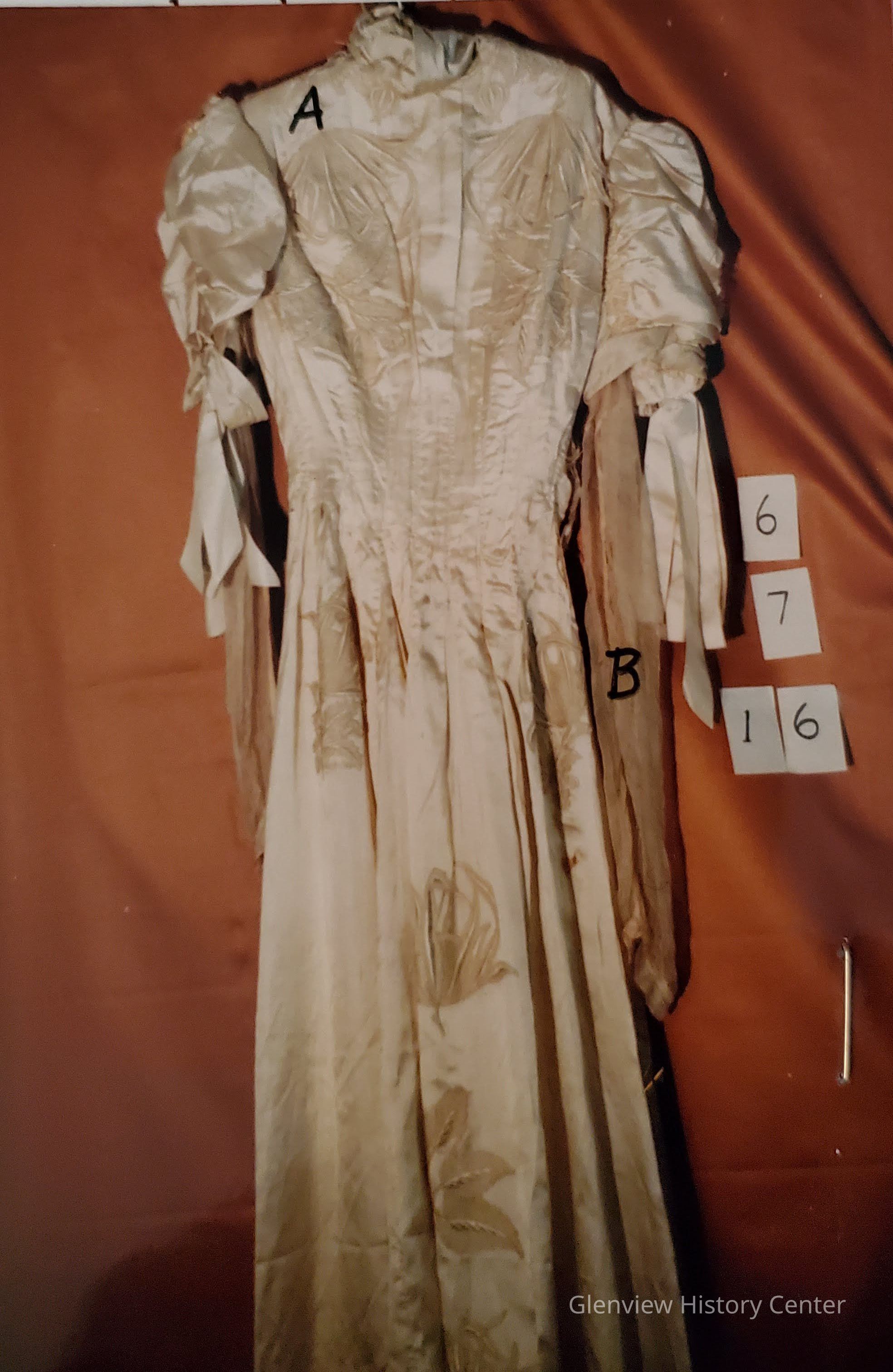 A) Cream color silk satin wedding dress: Style - sheath; Bodice is 7 boxed pleats from shoulder; pleats are sewn down and fitted in at waist; 4" front stays are sewn in with sewn in pleat on seam sleeves are 2/3 length (just above elbow) sleeves have 4 rows of shirring; large satin bow extends from shirring attached to outer sleeve in a fine chiffon sleeve extension - this makes a long sleeve. Ornate decoration is applied to silk/stain: there are two decorative patterns on either front shoulder. Lotus leaf pattern plus 5 leaf clusters: Over the shoulders are closed rosebud and leaf pattern; Center front panel has pattern repeat of flower and leaf design twice one flower pattern applied to silk on each hip. 3" stand-up collar is of brushed silk. Skirt has train.