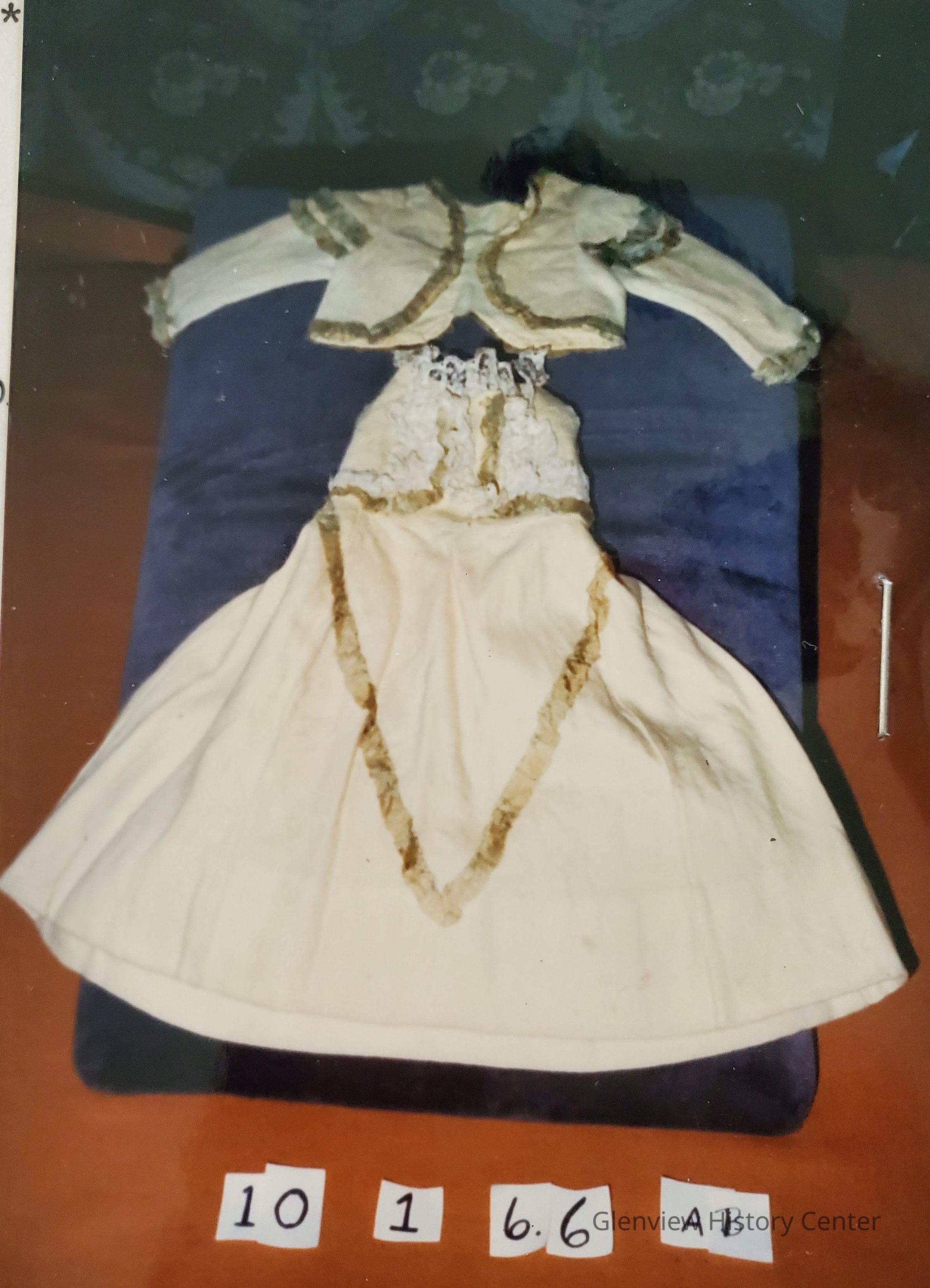 Dressy wool dress - doll size - lace bodice front; lace and ruched blue ribbon trim with matching jacket with ruched ribbon trim; unfinished armholes.General Notes