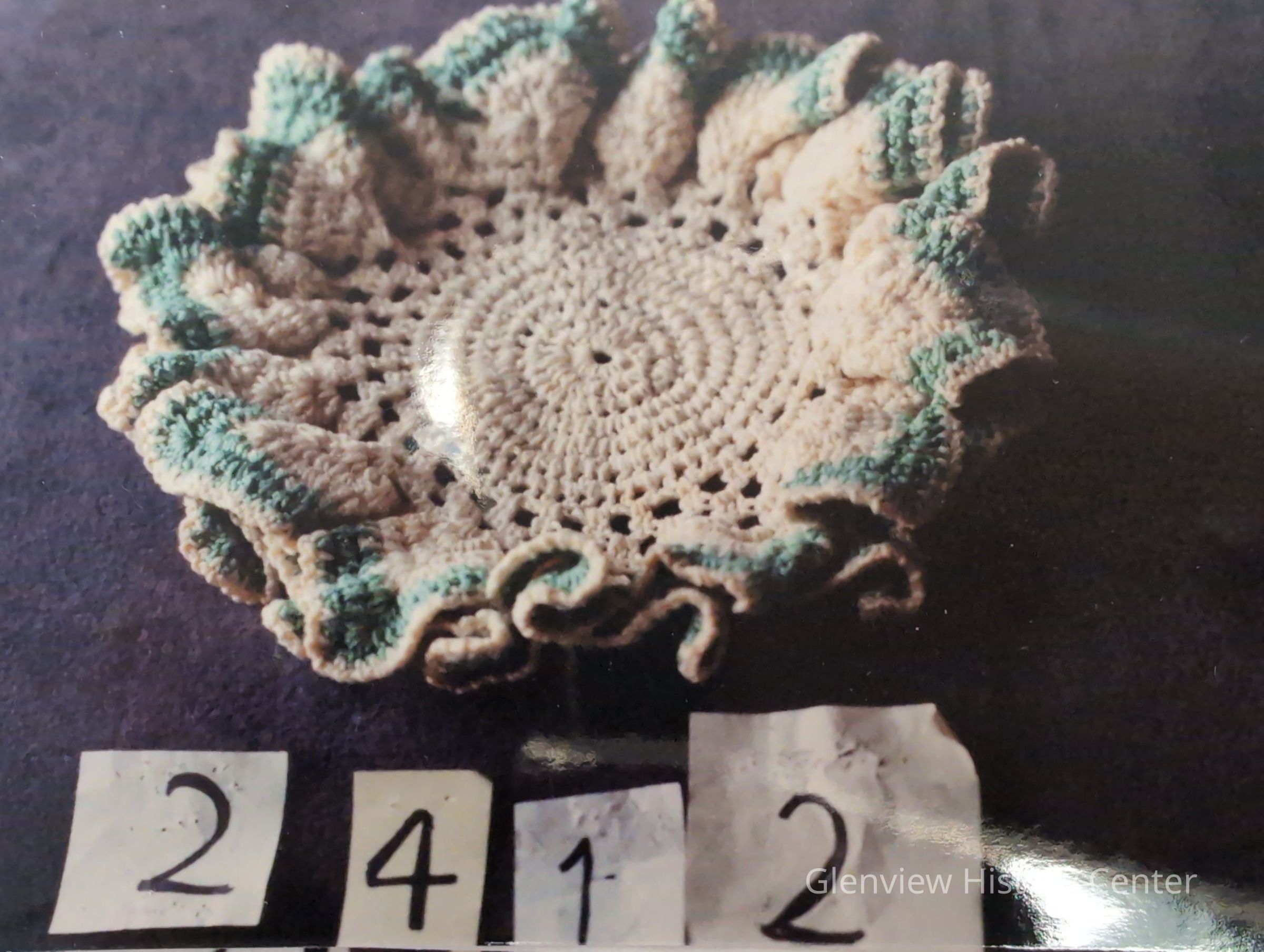 1 round crocheted doily white with blue/green edge 8 1/2" cotton