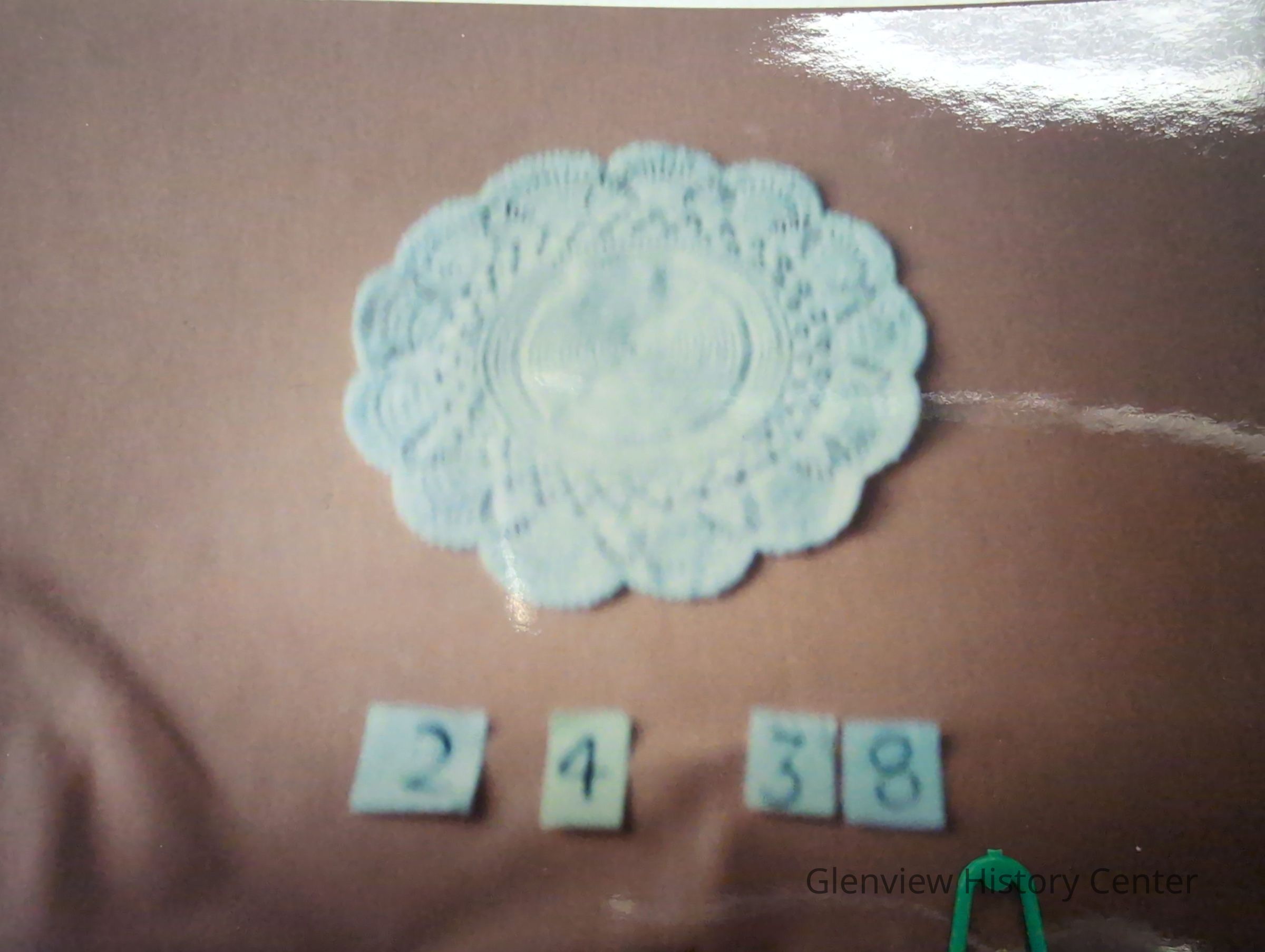 white cotton crochet doily 8 3/4" diameter center is 4 3/4' diameter with circular close stitching. border is scalloped and intricate crochet stitching surrounds the center section