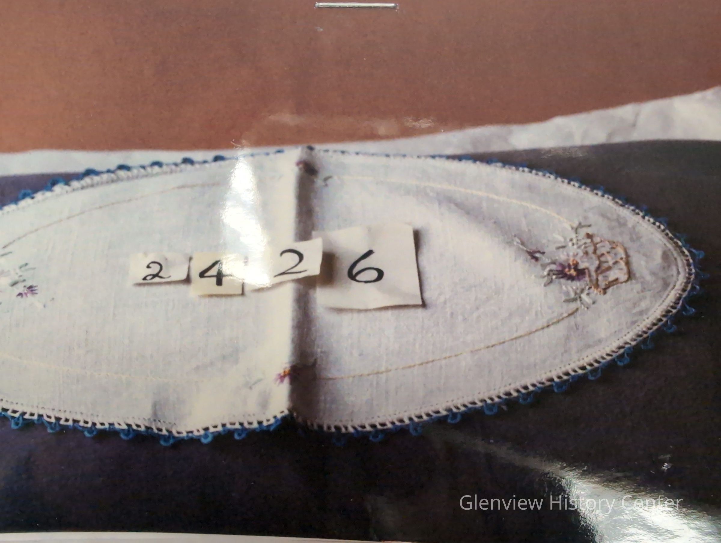 1 oval linen-embroidered flower basket at 2 ends blue edge 15 1/2 length