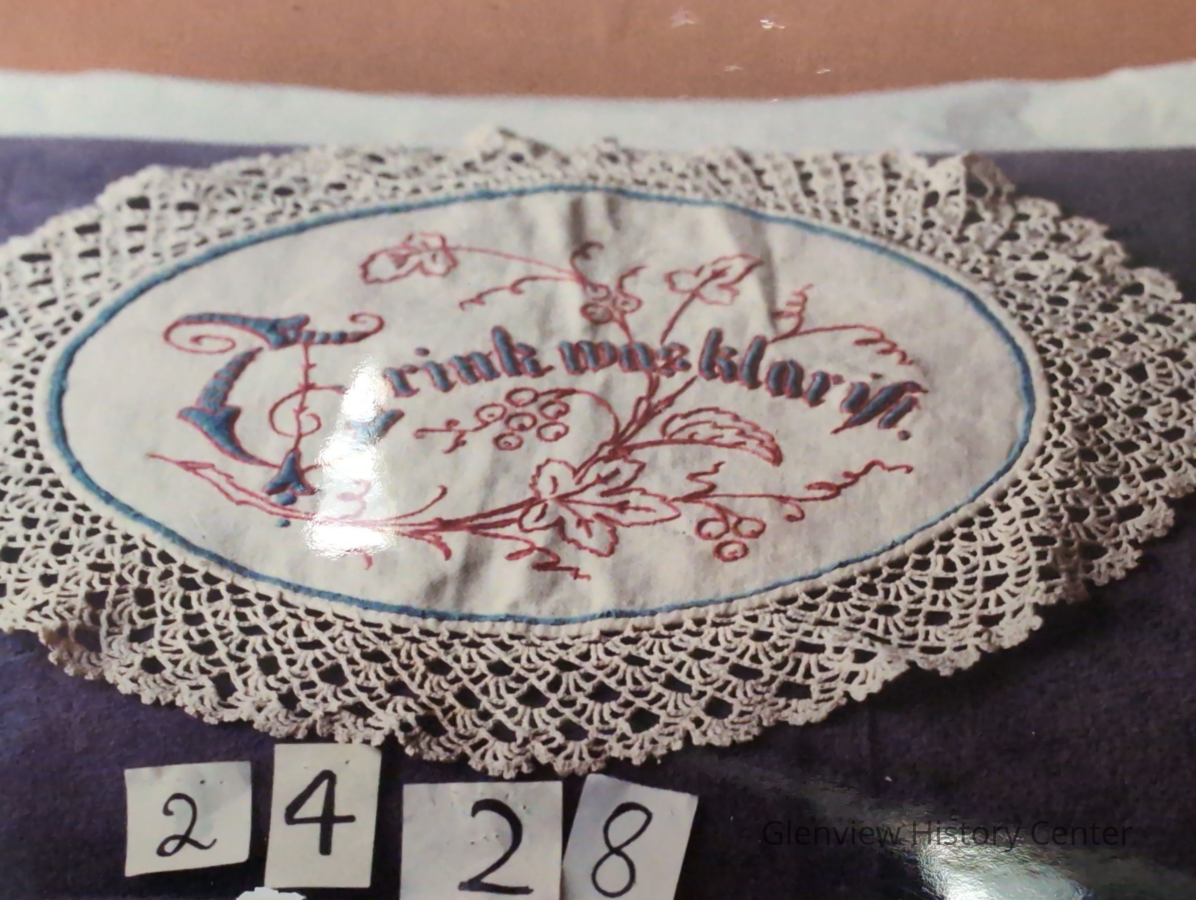 white cotton (13"x 11") oval doily; German lettering, embroidered blue with red out-lining; 2" tatted edge:(crocheted?)