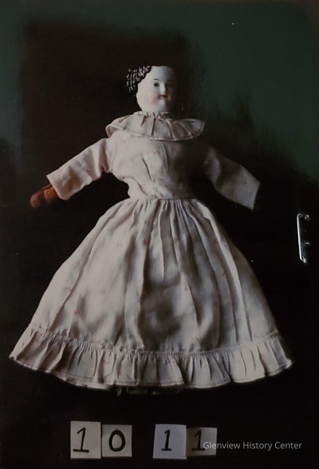 11" doll with china head, painted black hair, blue eyes with red eyelid line; leather arms of old mitt style; stuffed leather boots sewn on; painted stockings. Costume: original clothing dating back to Civil War. Petticoat, pantaloons and top.Acquisition