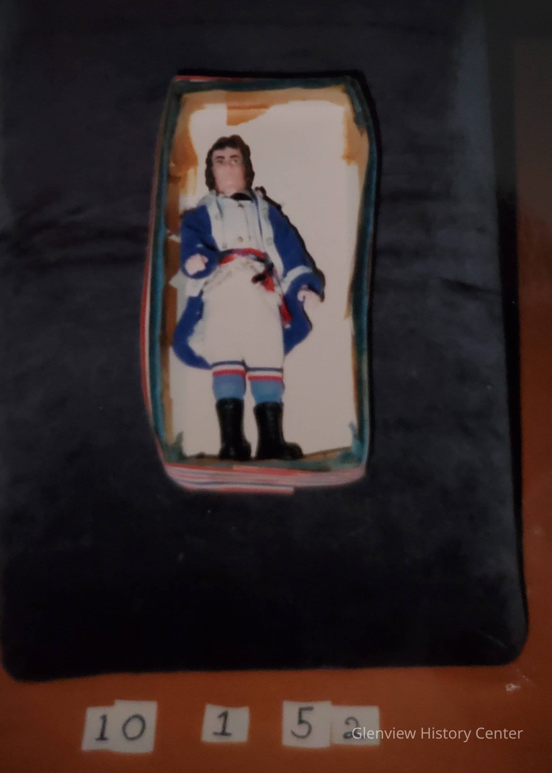 Doll in a series representing famous patriots during the Revolutionary Was period (possibly the Marquise de Lafayette - Uniform has a French Look). Body is plastic with painted hair and face and is dressed in blue coat with gold epaulettes and white lapels with buttons. White waistcoat with gold buttons; white breeches with red, white and blue garters, blue socks; black plastic boots and red, white and blue sash at waist.General Notes