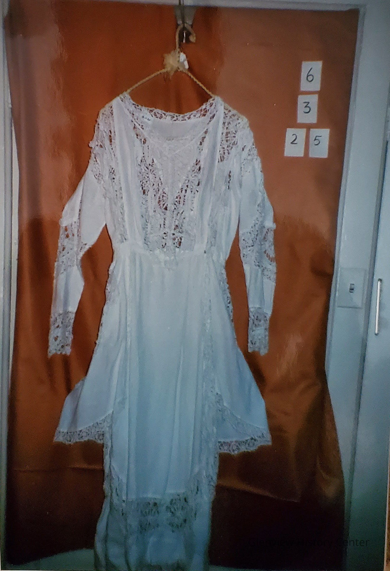 Full length fine cotton dress with front peplum apron, with hand crocheted work; back off center right hand close with metal snaps - 8 snaps and one hook and eye; full length sleeve, open crochet work at elbow, crochet button about 3/4 way up sleeve; neckline - jewel - V gosset front, deeper V neck line in back; back panel, open crochet, overlay of waistband. Hem - open crochet - 5" open lace work.