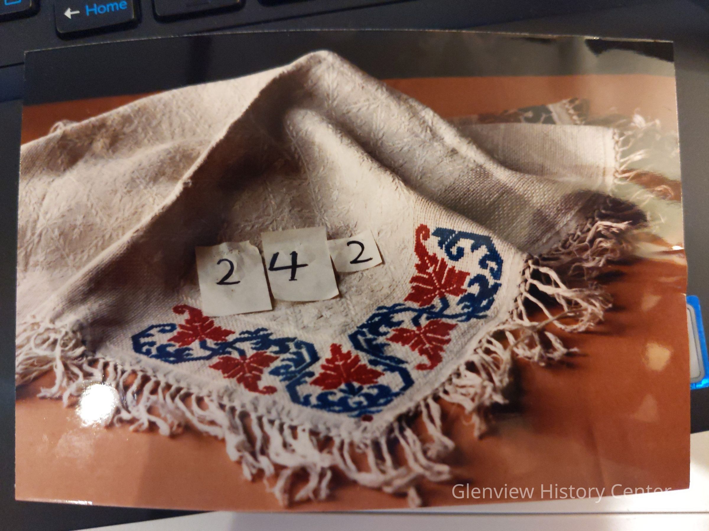 Rectangular cotton woven dresser scarf w/ knotted fringe, cream color, cross-stitched stylized maple leafs red & blue design.