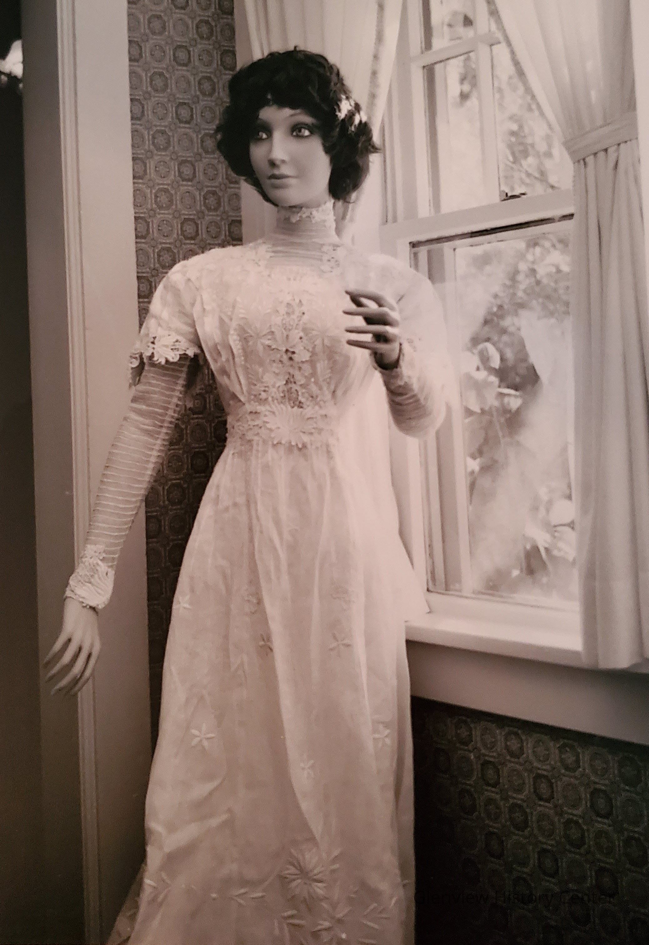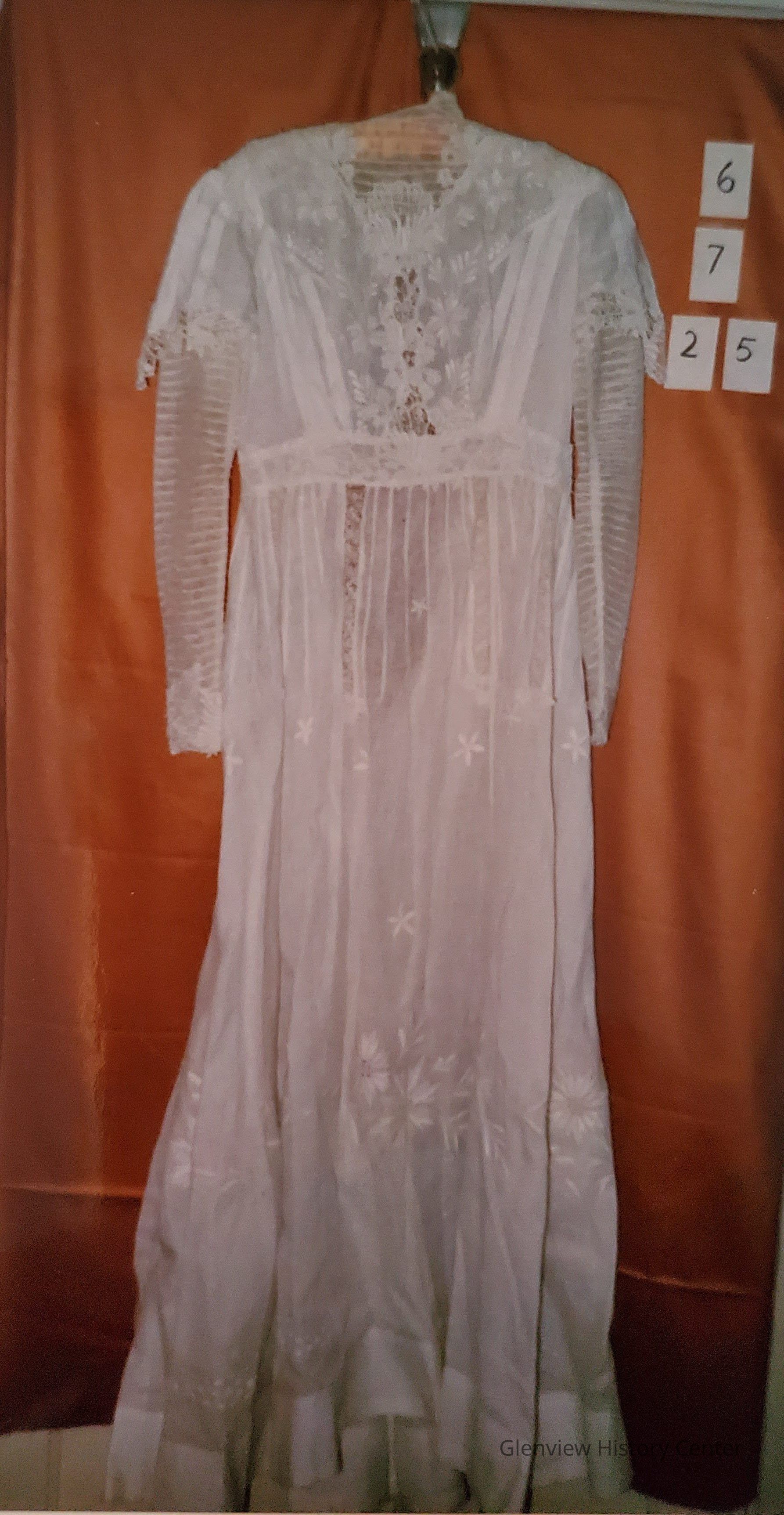 White cotton - stand-up collar princess lined fitted bodice with decorative lace cummerbund, 'A' line skirt with additional slight bustle effect. Short cap sleeve and under sleeve long wrist length with horizontal tucks every 3/8 of one inch. Bodice: stand-up collar with open lace 3" in height originally there were 2 stays. At top of stand-up collar edge is applied machine embroidered appliquéd stylized lotus flower and small vining pansy. The same machine embroidered appliqué outlines the netting and is attached to the bodice batiste. The appliqué is also applied at shoulder line. One lotus flower in the front and an additional one at the back. There is a seam dart beginning at middle of arms-eye and curves down to cummerbund. the front panel section of embroidered lace is 5" wide at cummerbund. There are 3 half inch tucks vertically on either side of lace appliqué. Lace appliqué  continues on at center front with a lotus flower on cummerbund at center front and continues around cummerbund with 3 lotus flowers on front and 4 on the back of cummerbund.