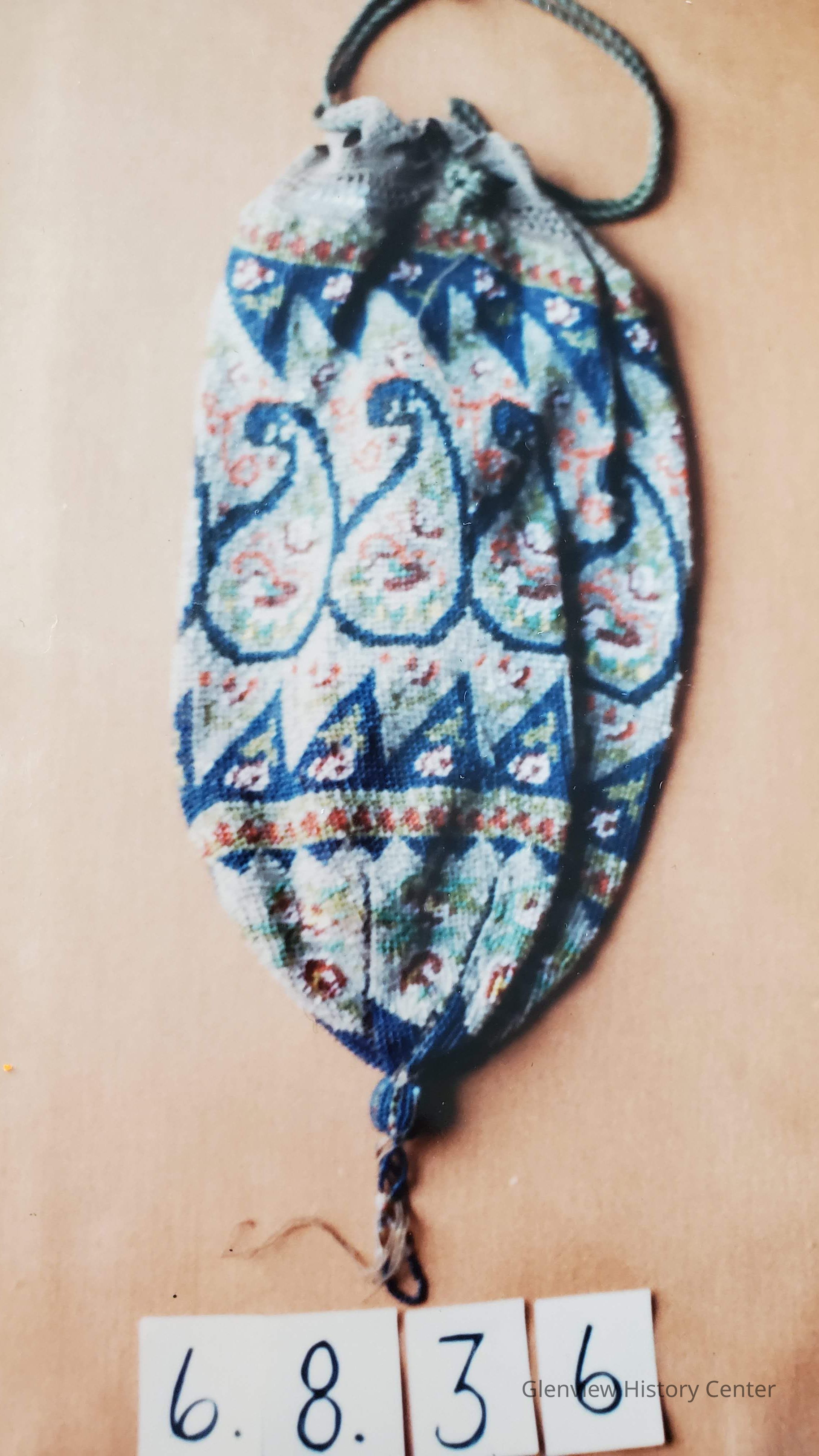 One bag 8" X 5" gathered at bottom. Top crocheted with cord tie. Beads: navy, tan-red and pink. Bag silk lined.Acquisition