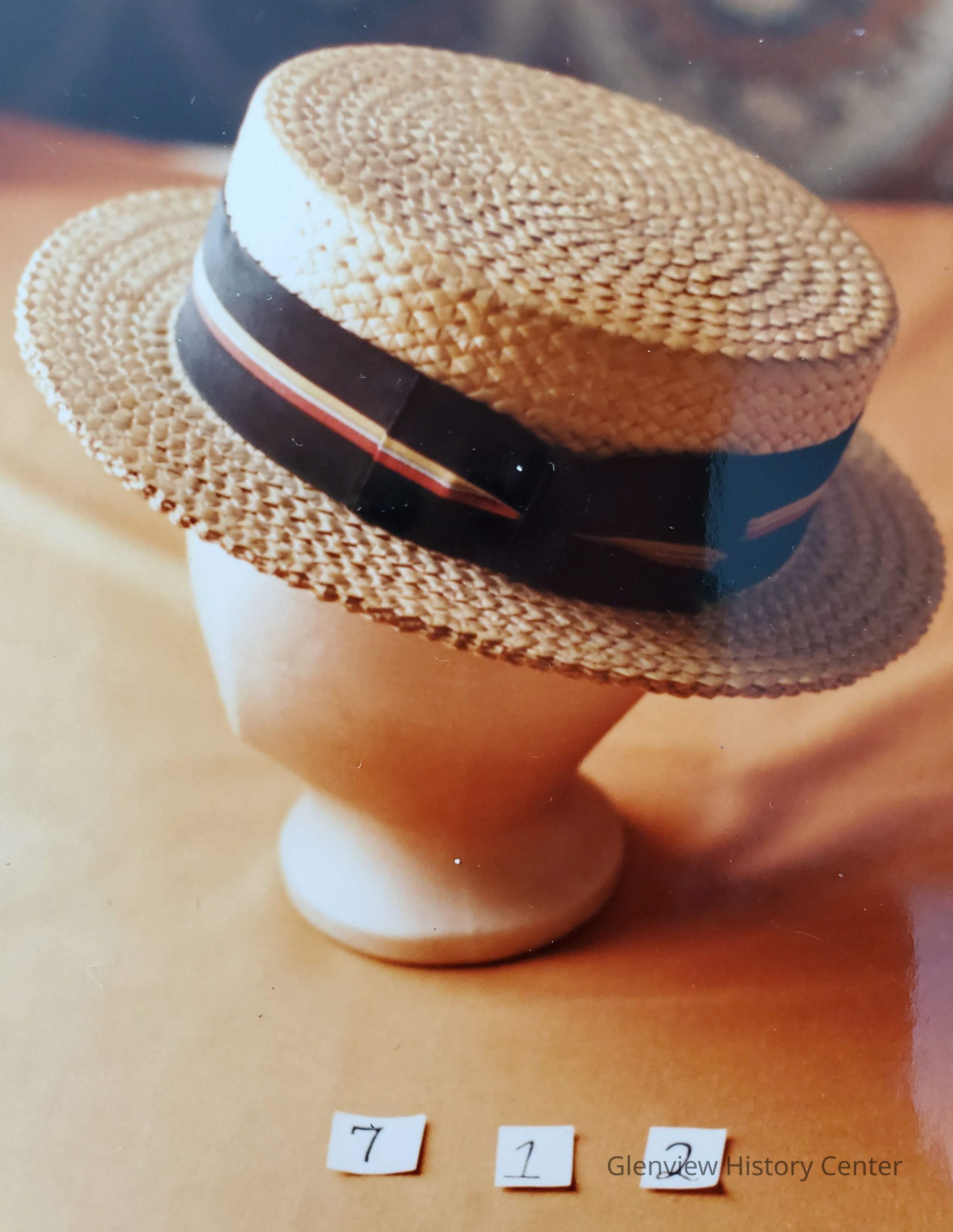 Tan straw boater - 2-1/2" black grograin with red and gold military stripes. Flat 2" brim - Royal Stetson - Leather headband stamped with John B. Stetson Co., 1224 Chestnut St., Philadelphia.
