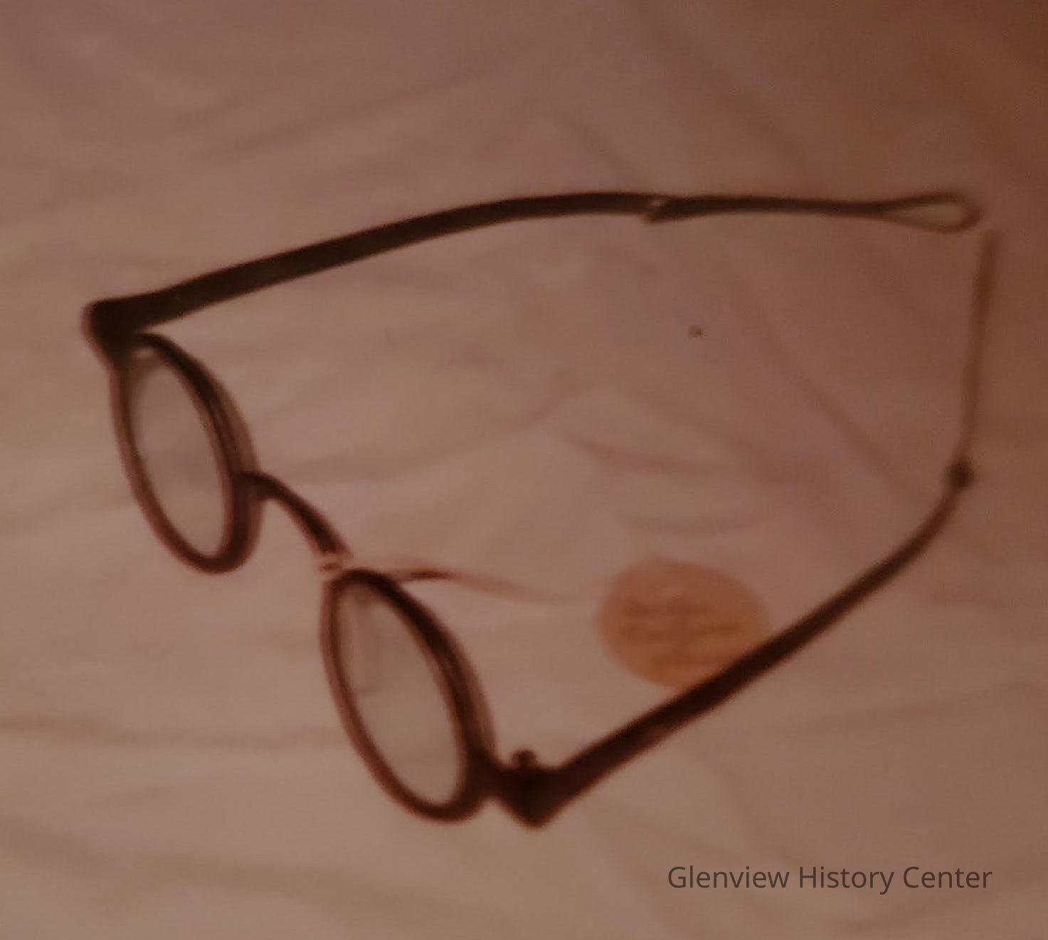 Eyeglasses with round lenses and metal rims and earpieces 4-1/4" L from which an extension (2-1/4" L folded) against the inside of each earpiece swivels to a length of 6-1/2". The lens frame are connected with a nose bridge but nose pads are not part of the construction. Circular lens inside frame has diameter of 1-1/4".Acquisition