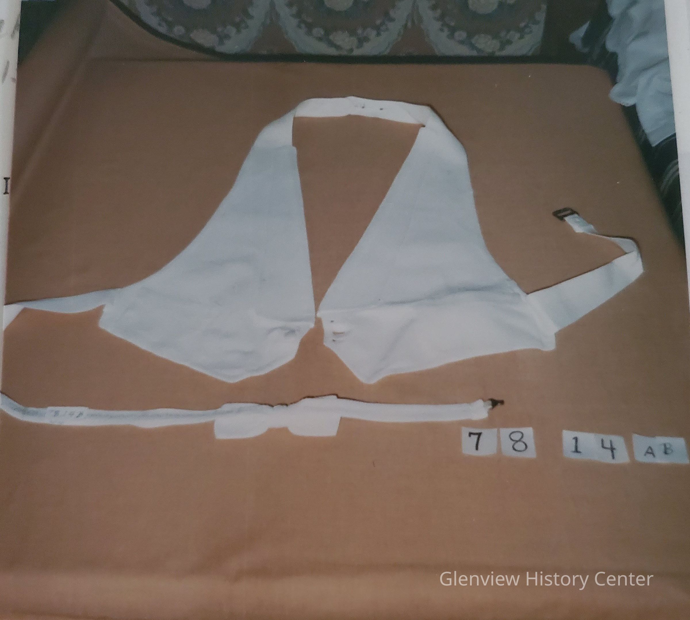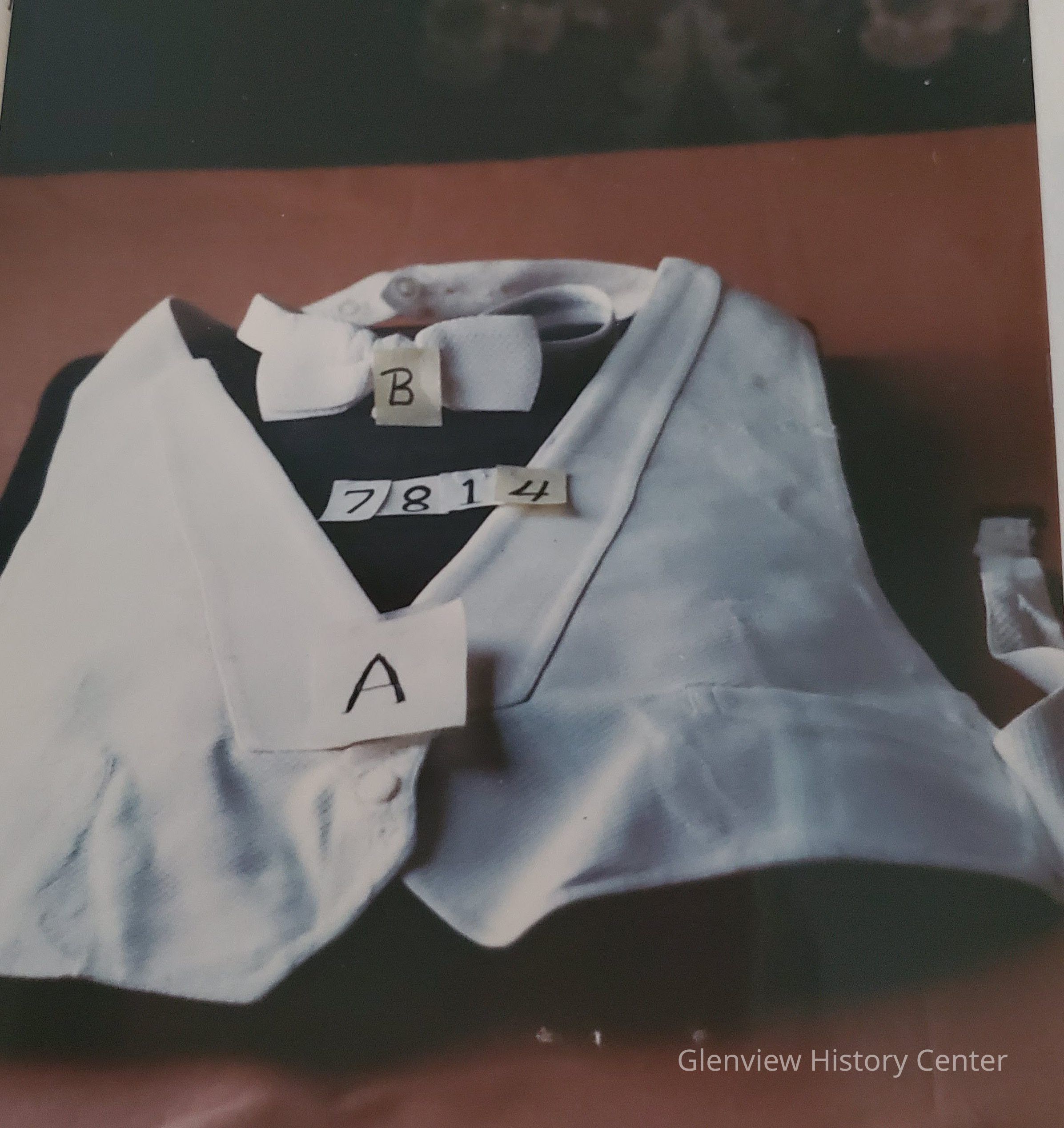 A) Tuxedo type in 2 sections white cotton shirt front buttoning at back of neck and at bottom of center front with 2 half belt type fastening at back with metal clasp.