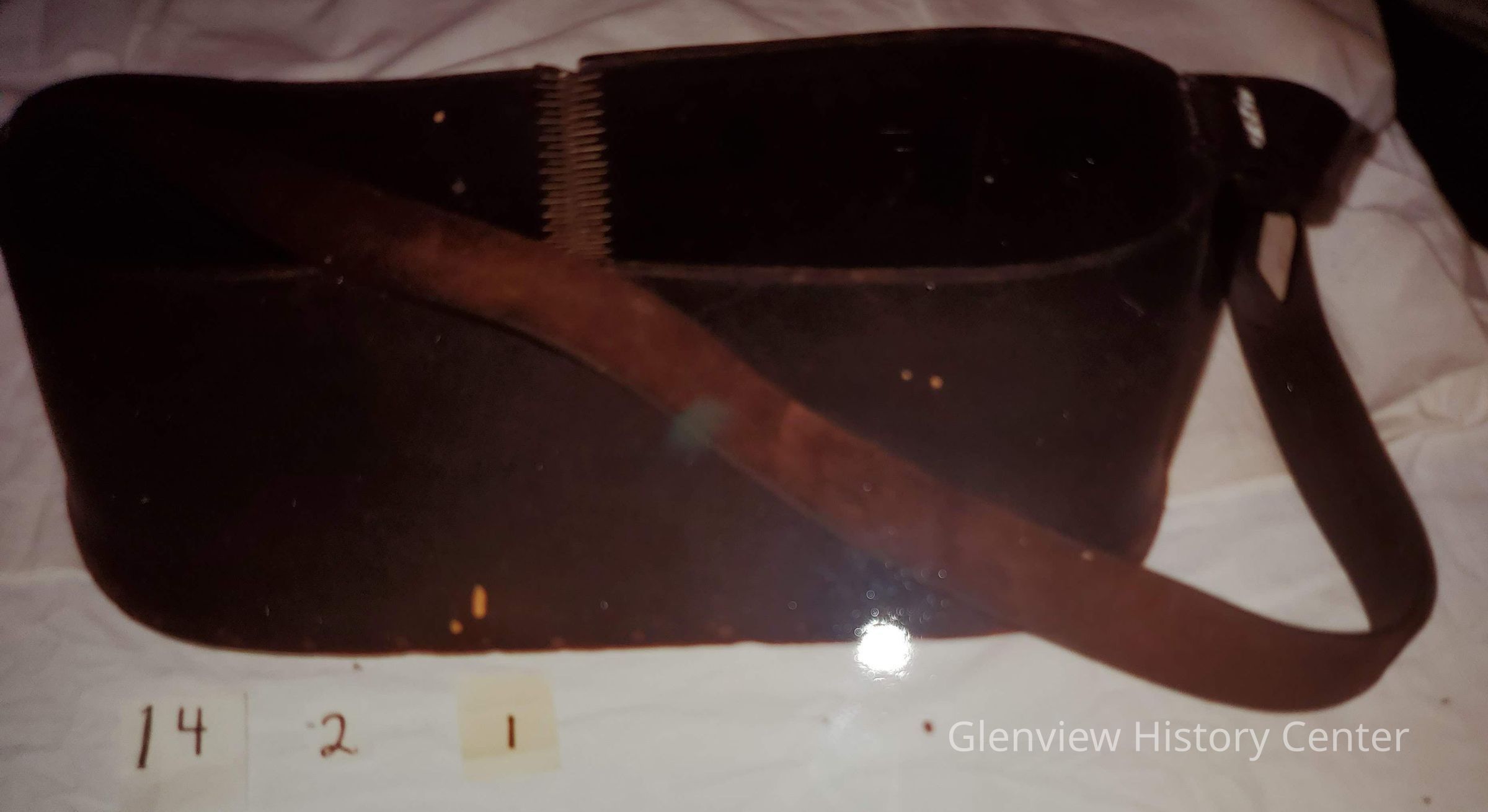 Leather (black case rectangular with wooden bottom - open top (no lid). Long black shoulder length strap of black leather 2" wide attached at each end of case with metal hinges.Acquisition