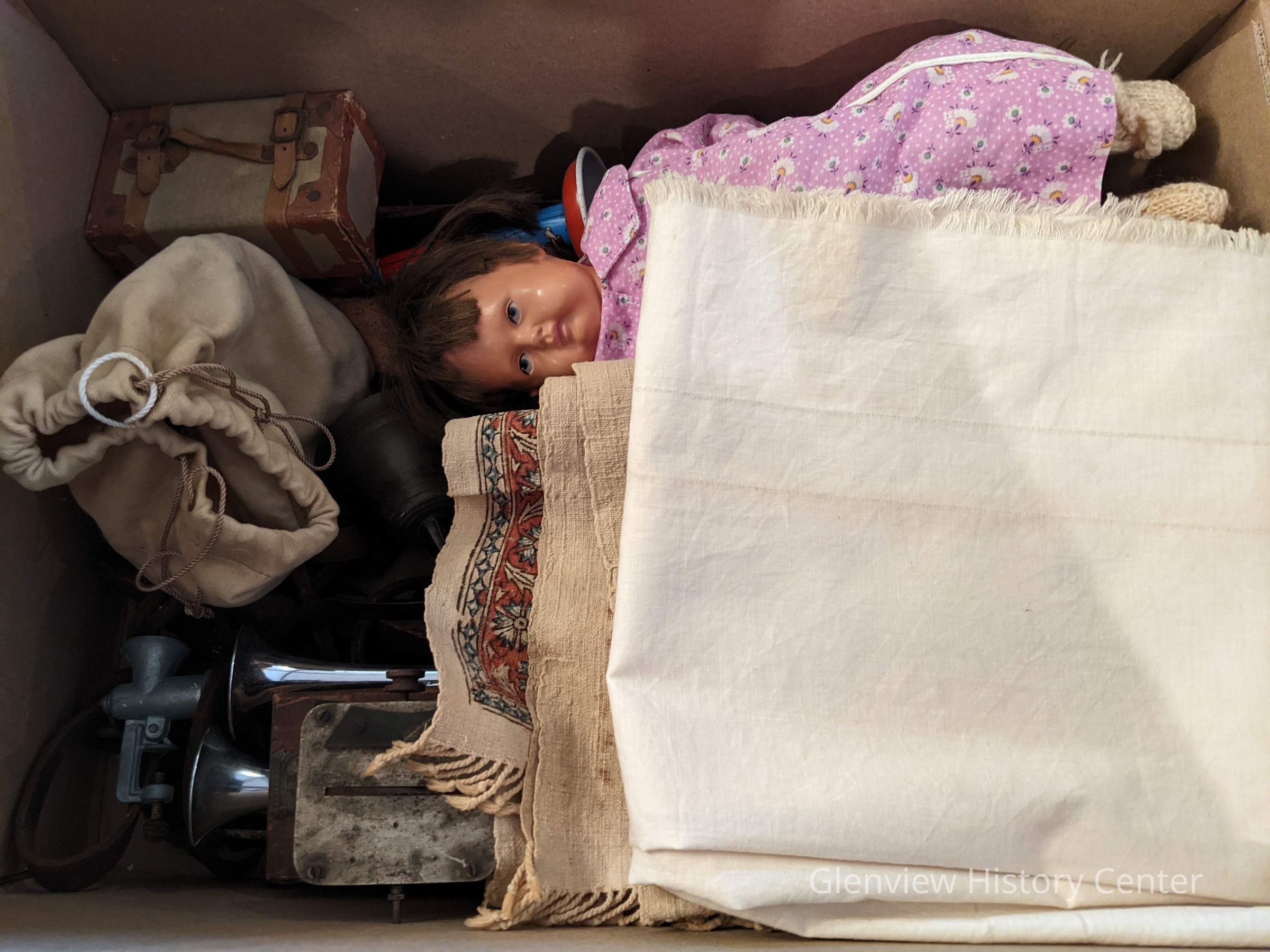 Items moved from the Toy Room during construction. This box includes three pairs of ice skates, metal toys, and a doll.