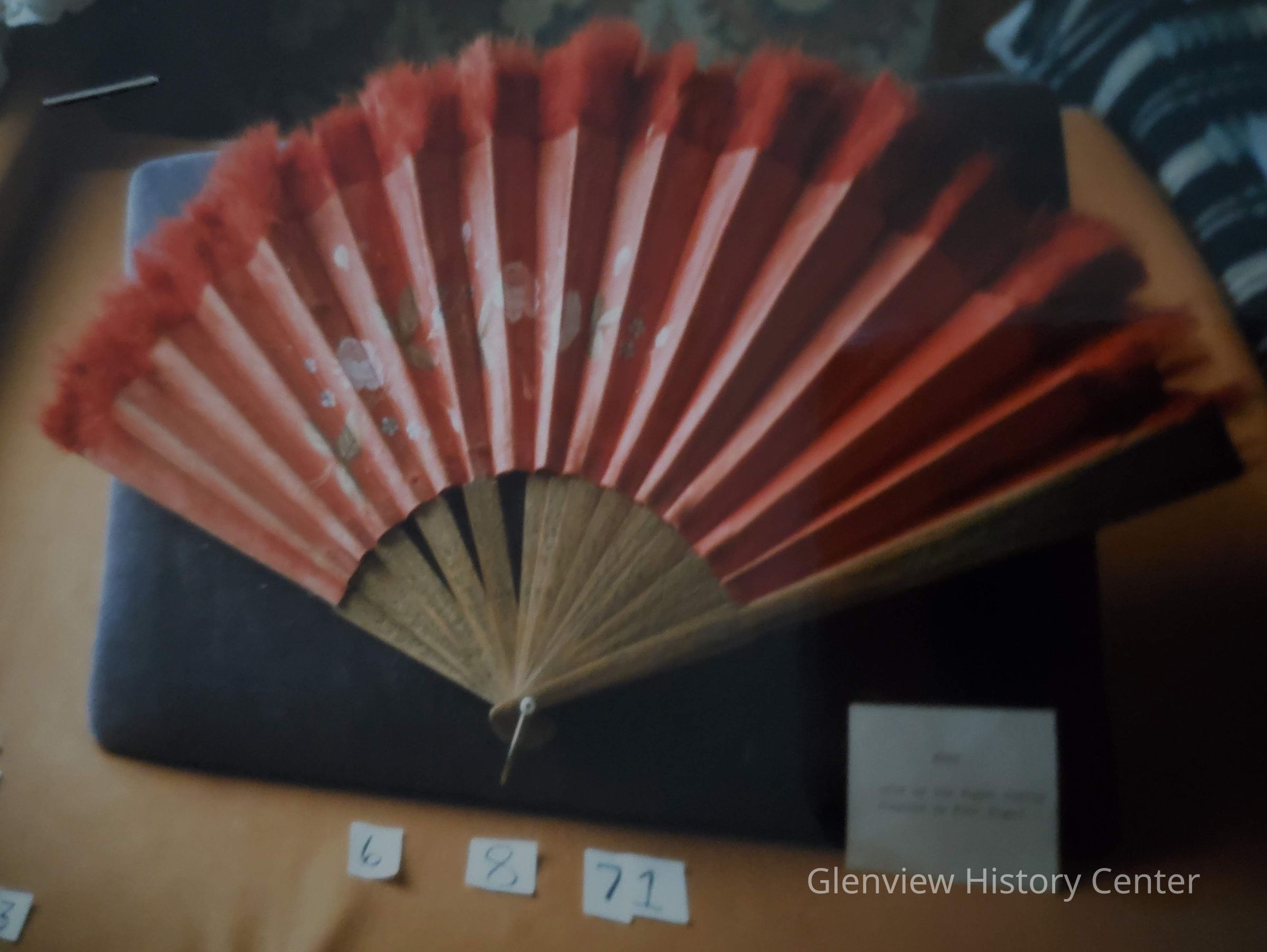 Fan - Red canvas leaf decorated with hand painted roses, sticks of wood, top of fan edged with red ostrich feathers.