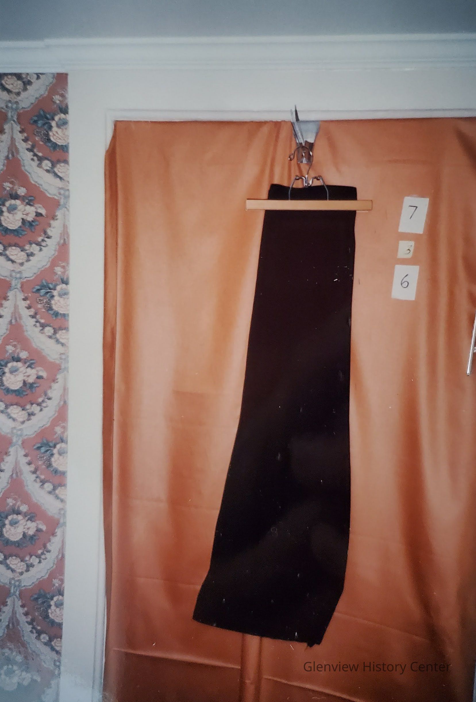 Black wool trousers. Five button on fly front additional flap on inside to button for protection. Six buttons at top for suspenders.Acquisition