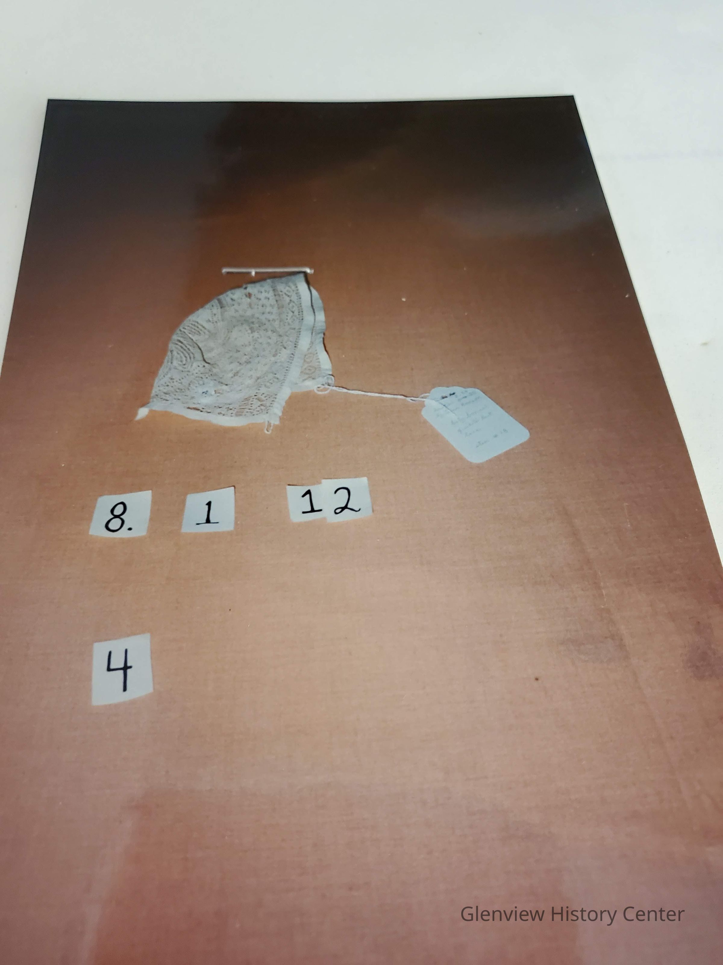 Small infant's cap knitted with open design areas with 1/4" trim of cotton batiste hand basted to knitted portion with a 1/4" hem. Length 7-1/2" with 12-1/2" on crown length. Pattern is a swirl flower at back of cap. Open thread work in 3 rows between crown and outer edge. The cotton hem is torn at center back. There are 2 thread loops.Acquisition