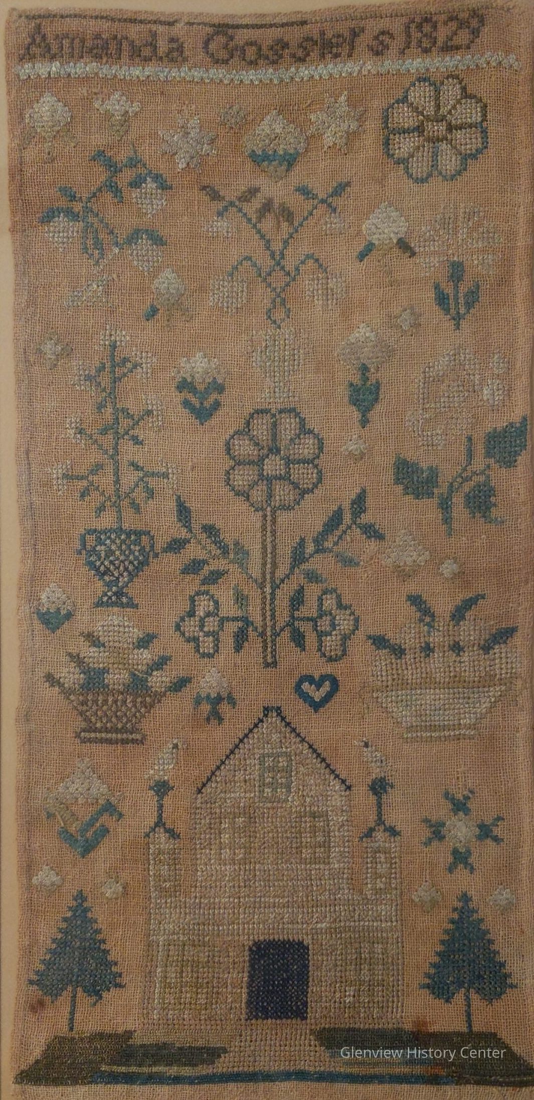 Framed embroidered sampler from 1829 by Amanda Gossler