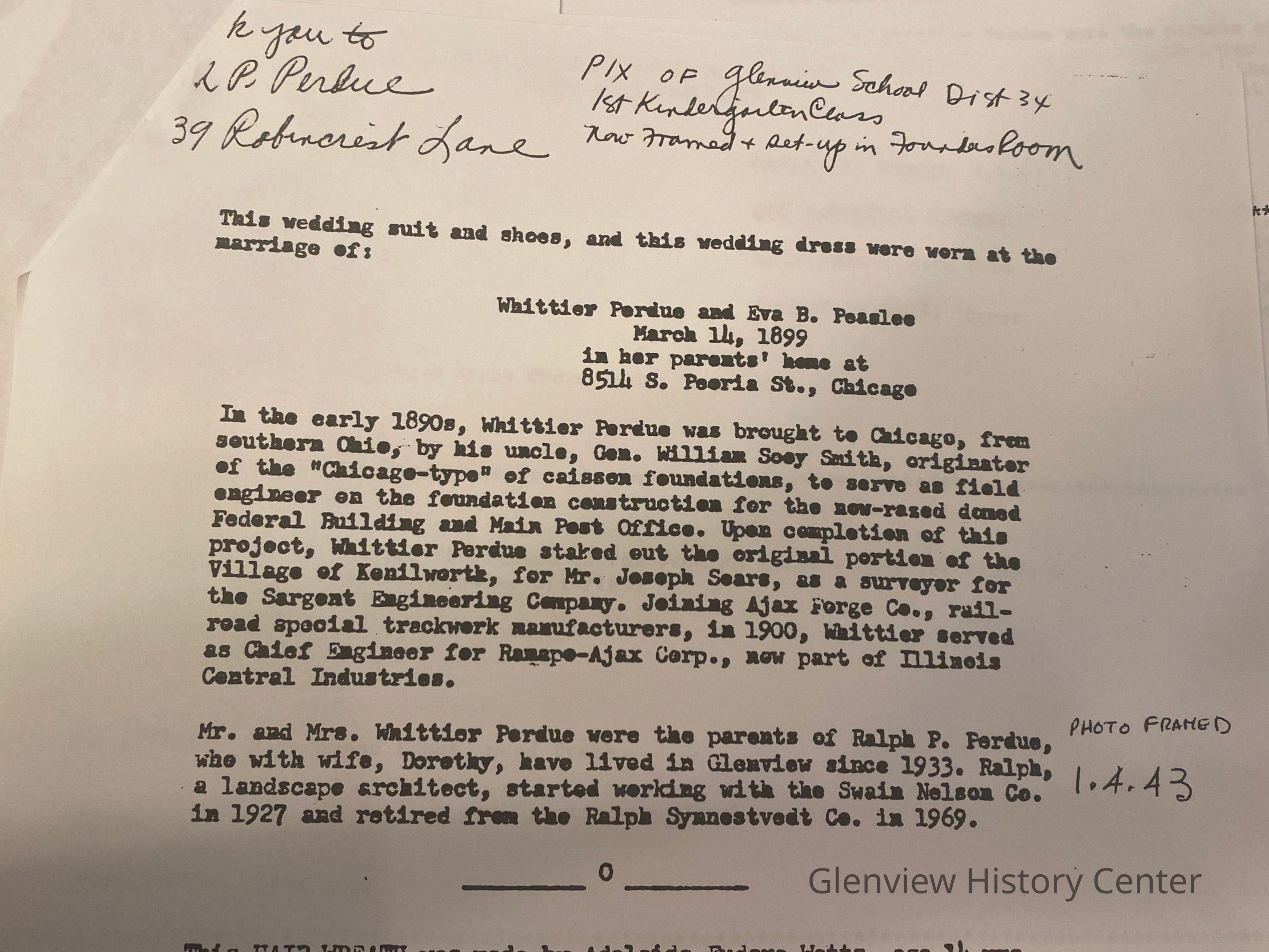 Mr. and Mrs. Whittier Perdue were the parents of Ralph P. Perdue, who with wife, Dorothy, have lived in Glenview since 1933. Ralph, a landscape architect, started working with the Swain Nelson Co. in 1927 and retired from Ralph Synnestvedt Co. in 1969.