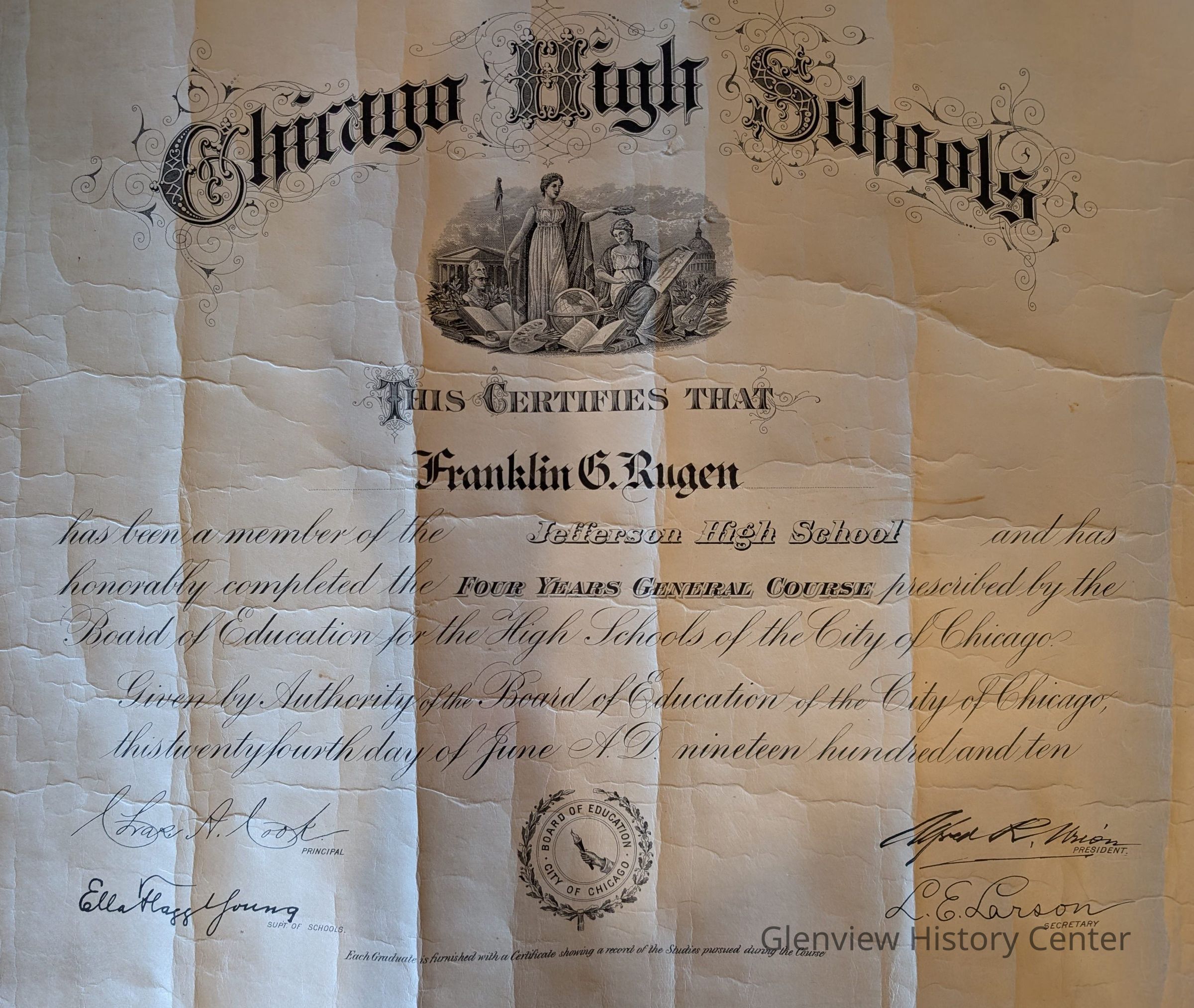 Frank Rugen's 1910 diploma from Jefferson High School in Chicago