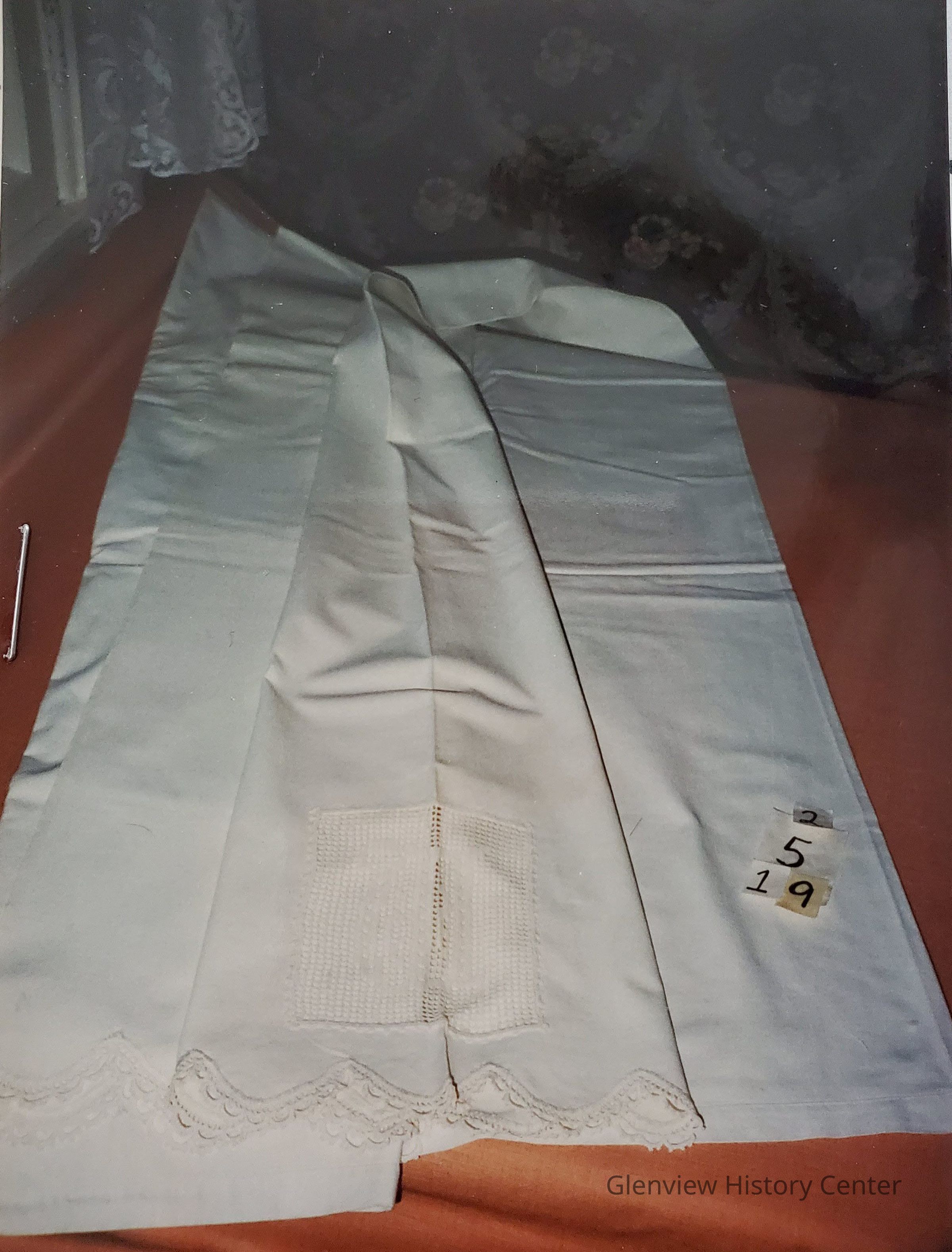 Double bed sheet trimmed two inch machine lace flower design.