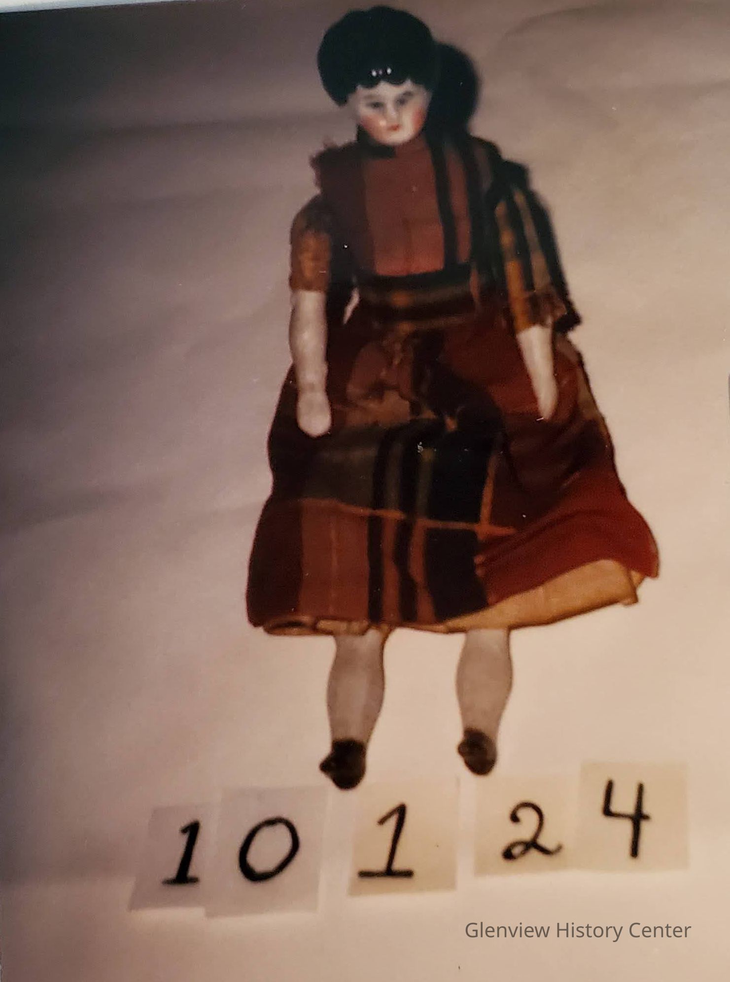 8" doll with china head or apple head, painted black hair; stone china arms and legs; stuffed body; molded stocking. Costume: wool dress; cotton underwear. Made from 1880 to start of WWI, 1914, Germany.Acquisition