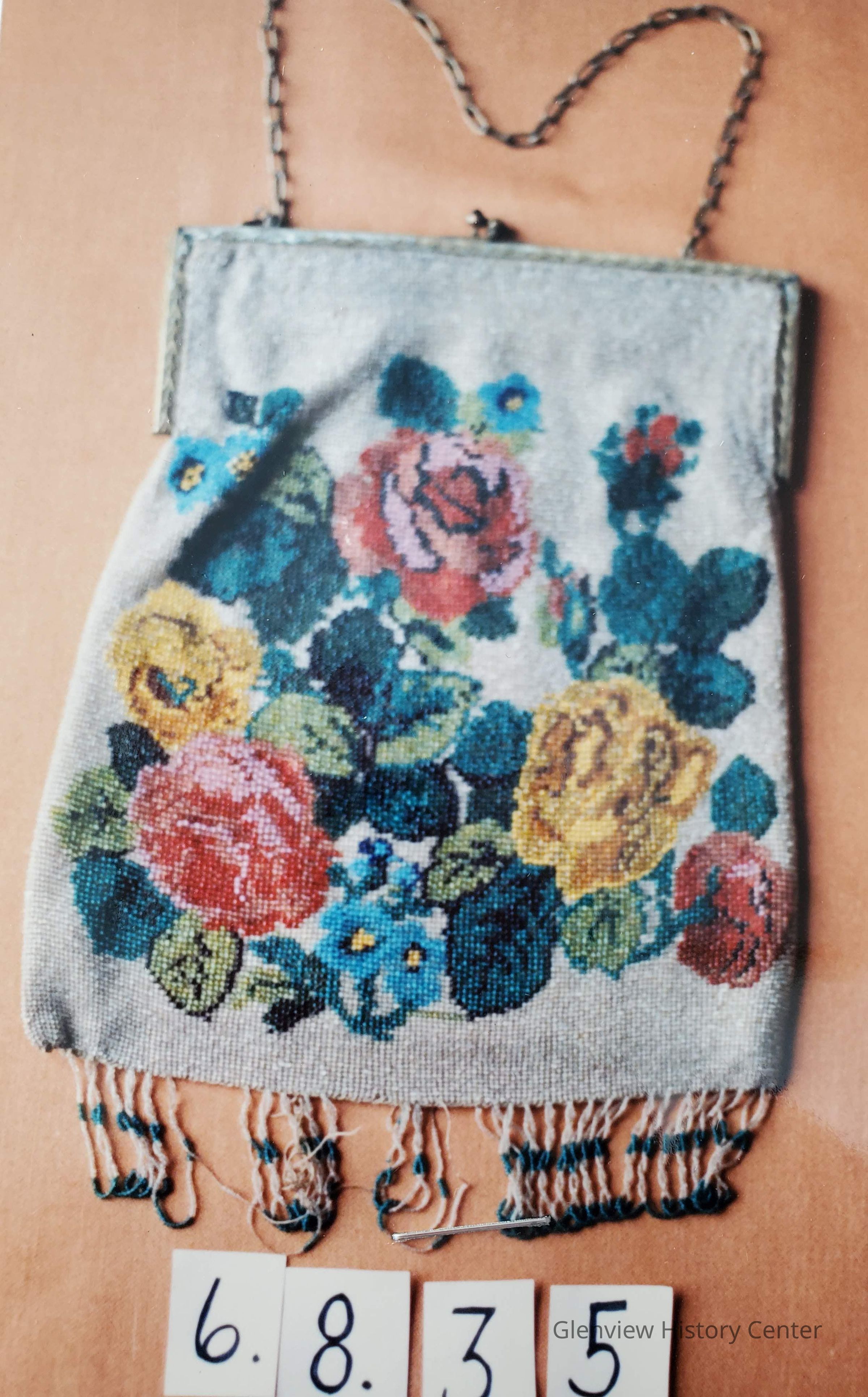 Glass beaded bag with background of clear beads with a floral design of multicolored glass beads, looped fringe at bottom. Glass beaded yellow, red and blue floral bag with brass metal frame of vine designs etched in clasp with blue stones mounted at top.Acquisition