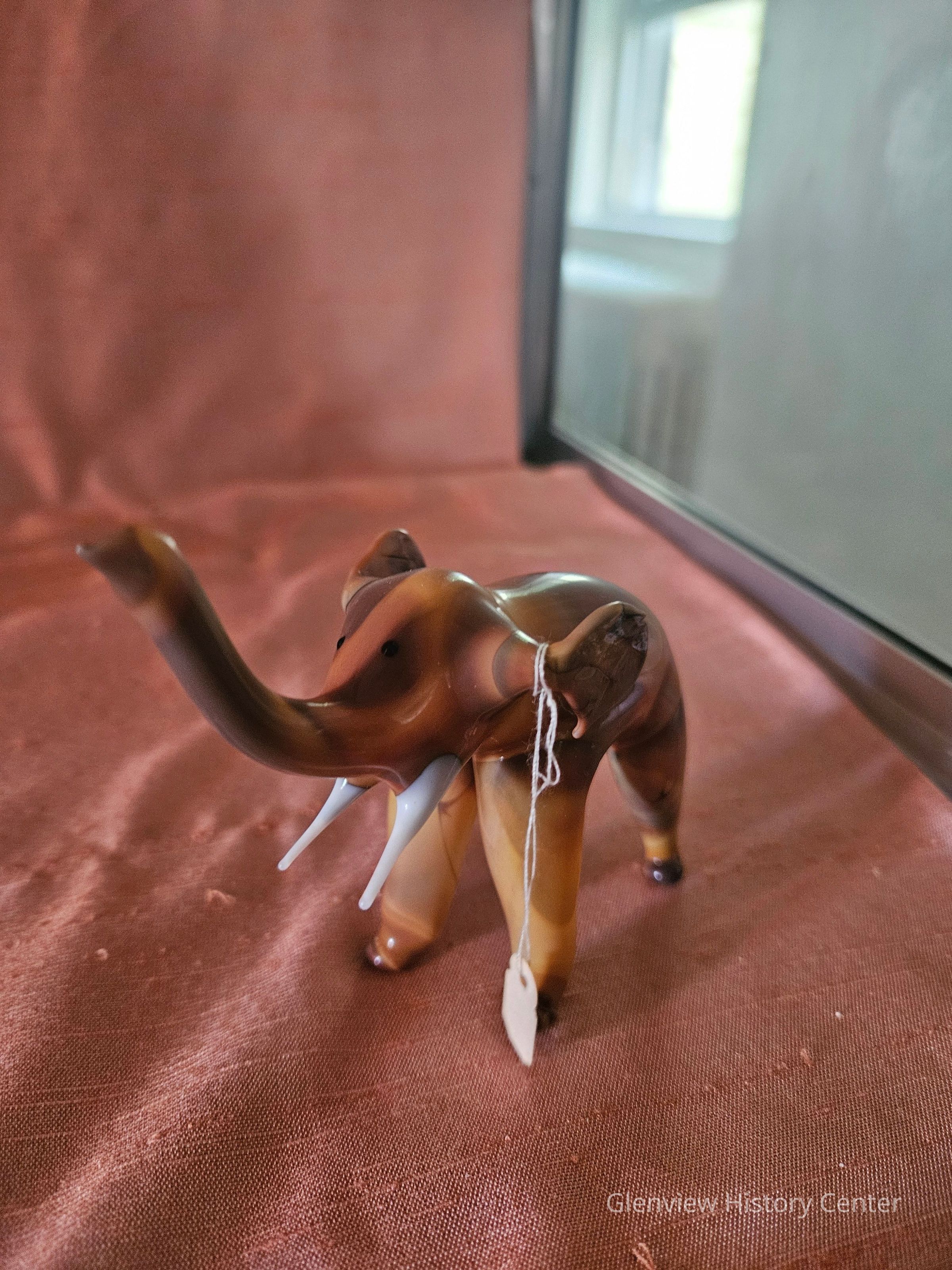Hallow handblown glass figurine of an elephant. Tusks are white. Black dots represent eyes. Color of body is shade of tanAcquisition