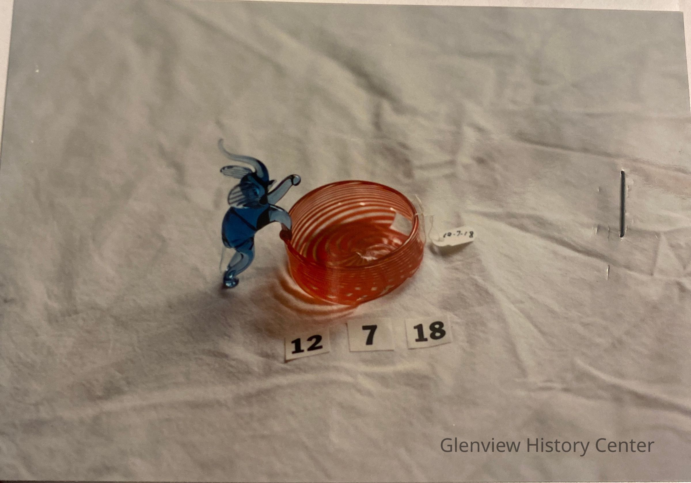 Handblown glass figurine of elephant colored blue resting one front foot at rim of glass receptacle, probably representing a reservoir. The receptacle is clear glass decorated with pinwheel swirl colored red-orange.Acquisition