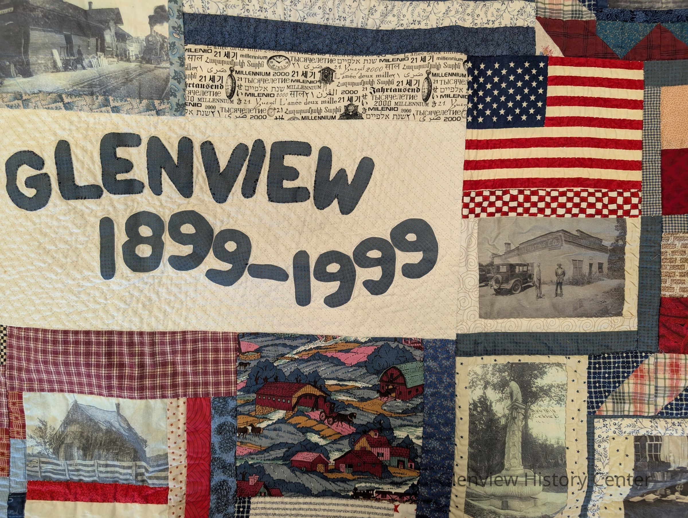 A patriotic-looking quilt featuring iconic old photographs of Glenview. Includes images of the Grove School, Wagner Farm, the Jackman Bear, the public library, the baseball team, the Naval Air Station, the train station, McCullen Real Estate, a Glenview garage, and an ice skater.Context