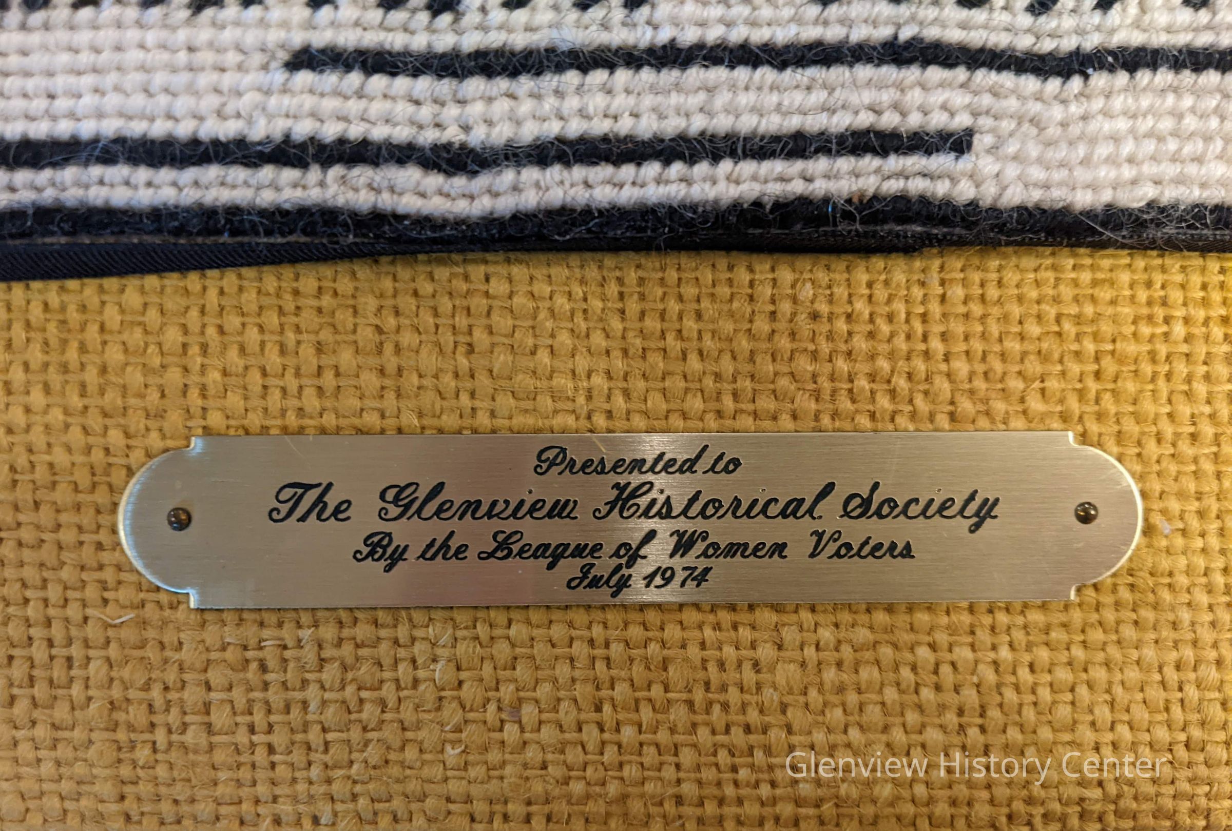Presented by the League of Women Voters by then president Hellen Miller. The needlepoint was created by Jean Barnes.Acquisition