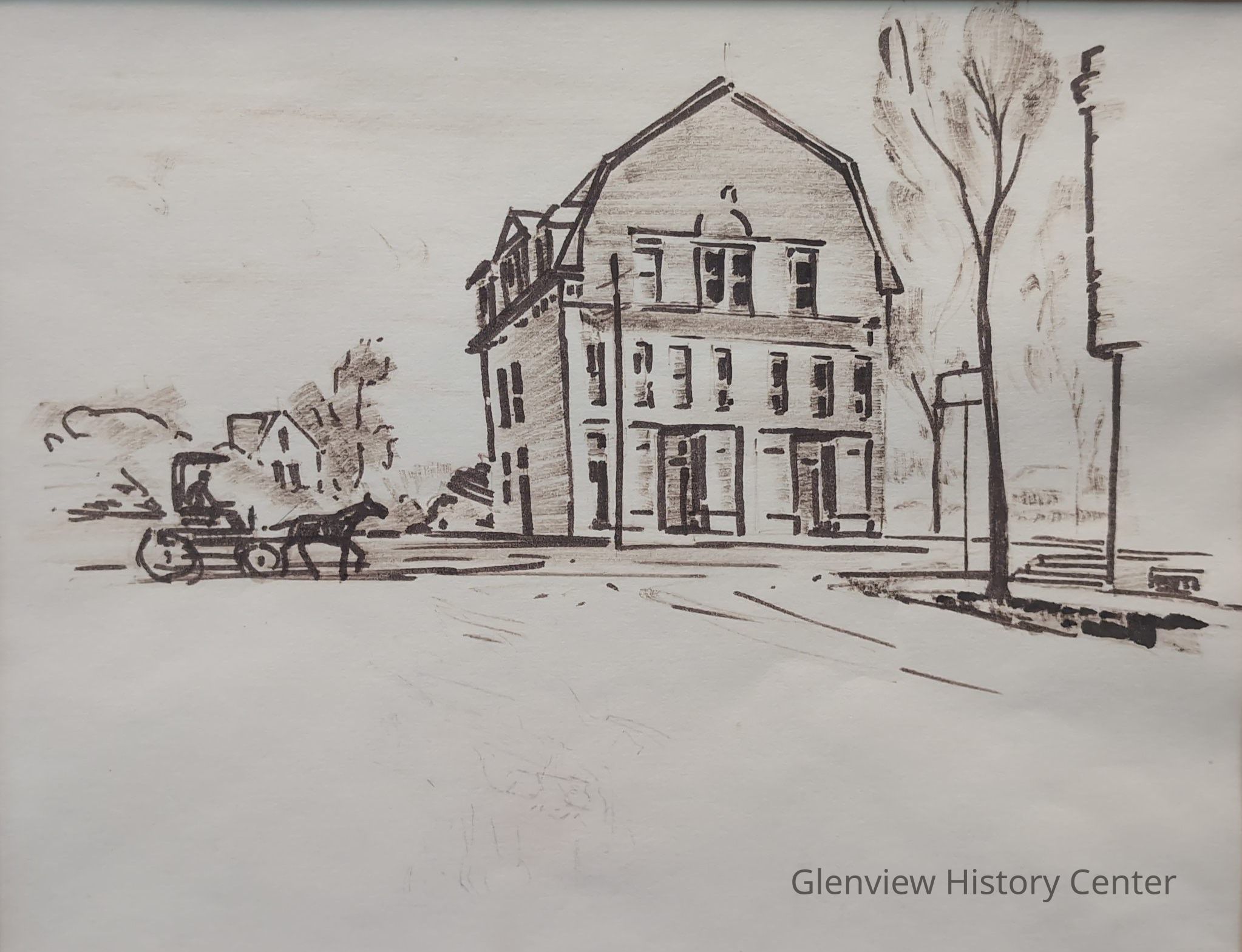 Drawing of the Glenview House as it would have looked in the early 20th century with its third story dance hallContext