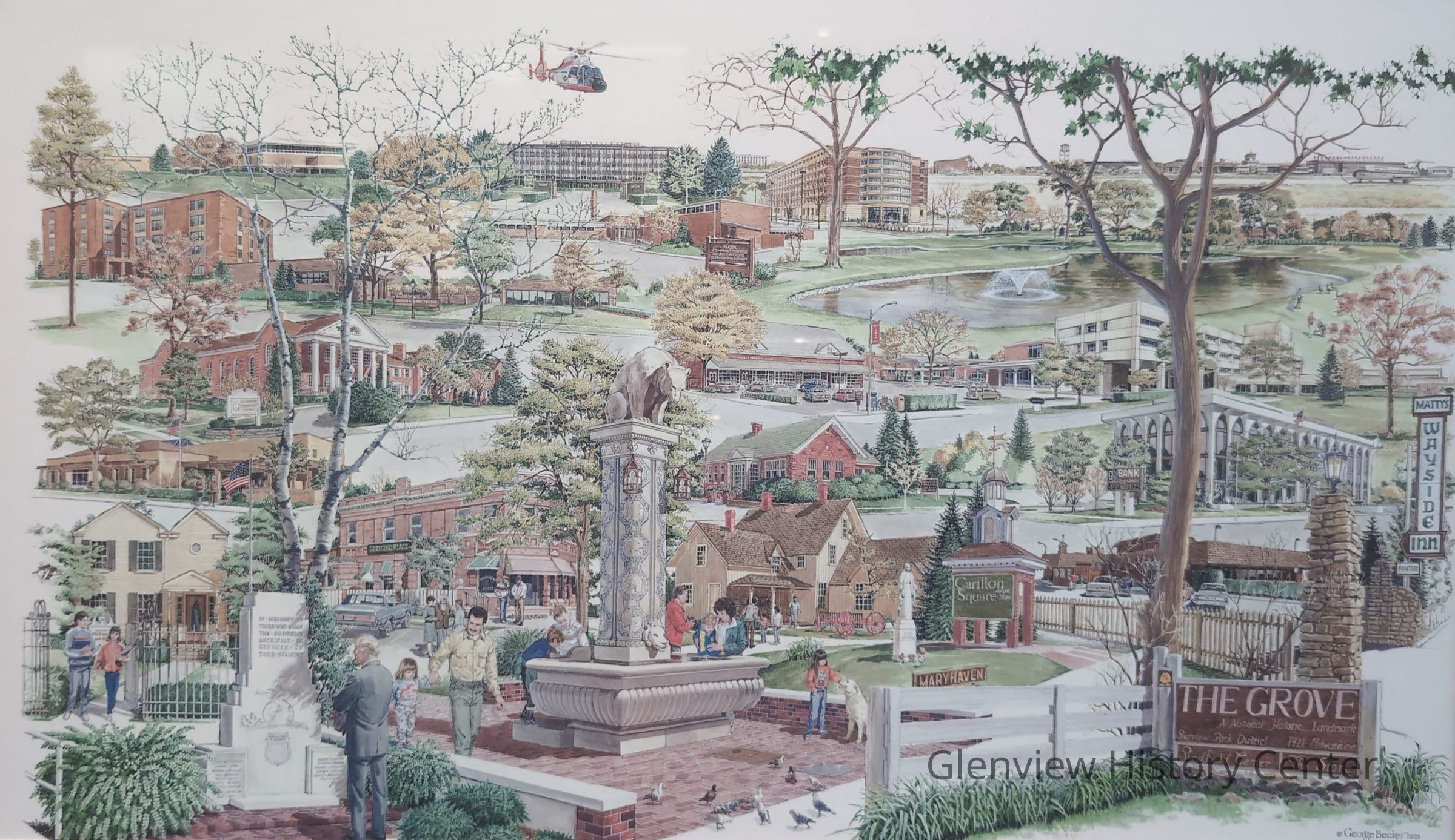 George Becker lived in Glenview from 1955 until his death in 1996. He was a well-known illustrator and he depicted himself in this montage facing the Veteran's Memorial.