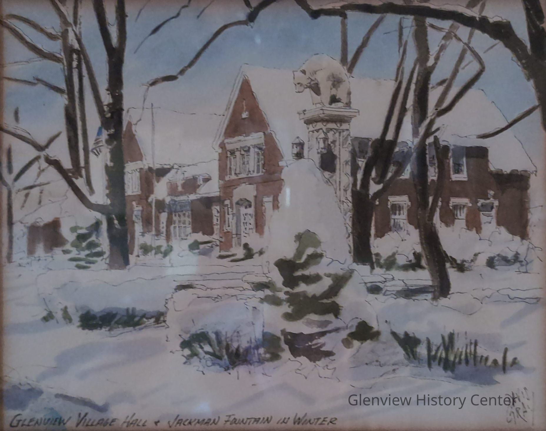 The Glenview Village Hall and Jackman Fountain depicted by Gray's WatercolorsContext
