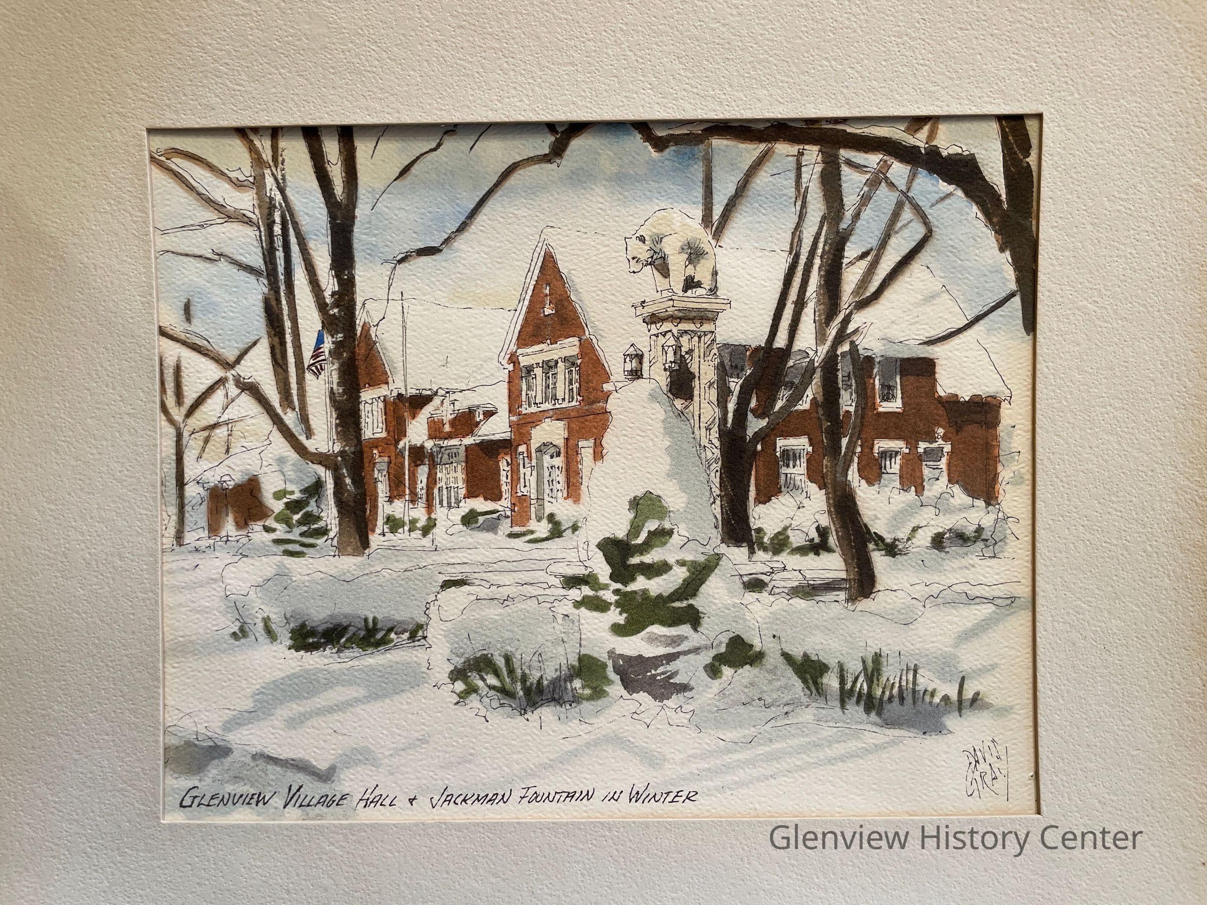 Gray's Watercolor of Glenview Village Hall and the Jackman FountainContext