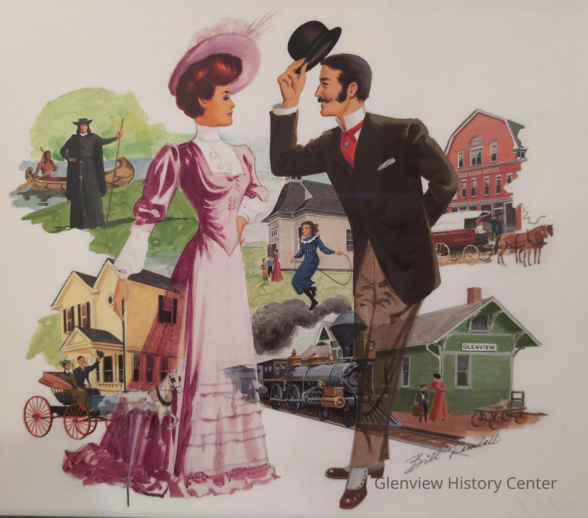 Glenview artist, Bill Randall painted this montage of historic local scenes to commemorate the Village of Glenview's 75th Birthday Celebration in 1974.