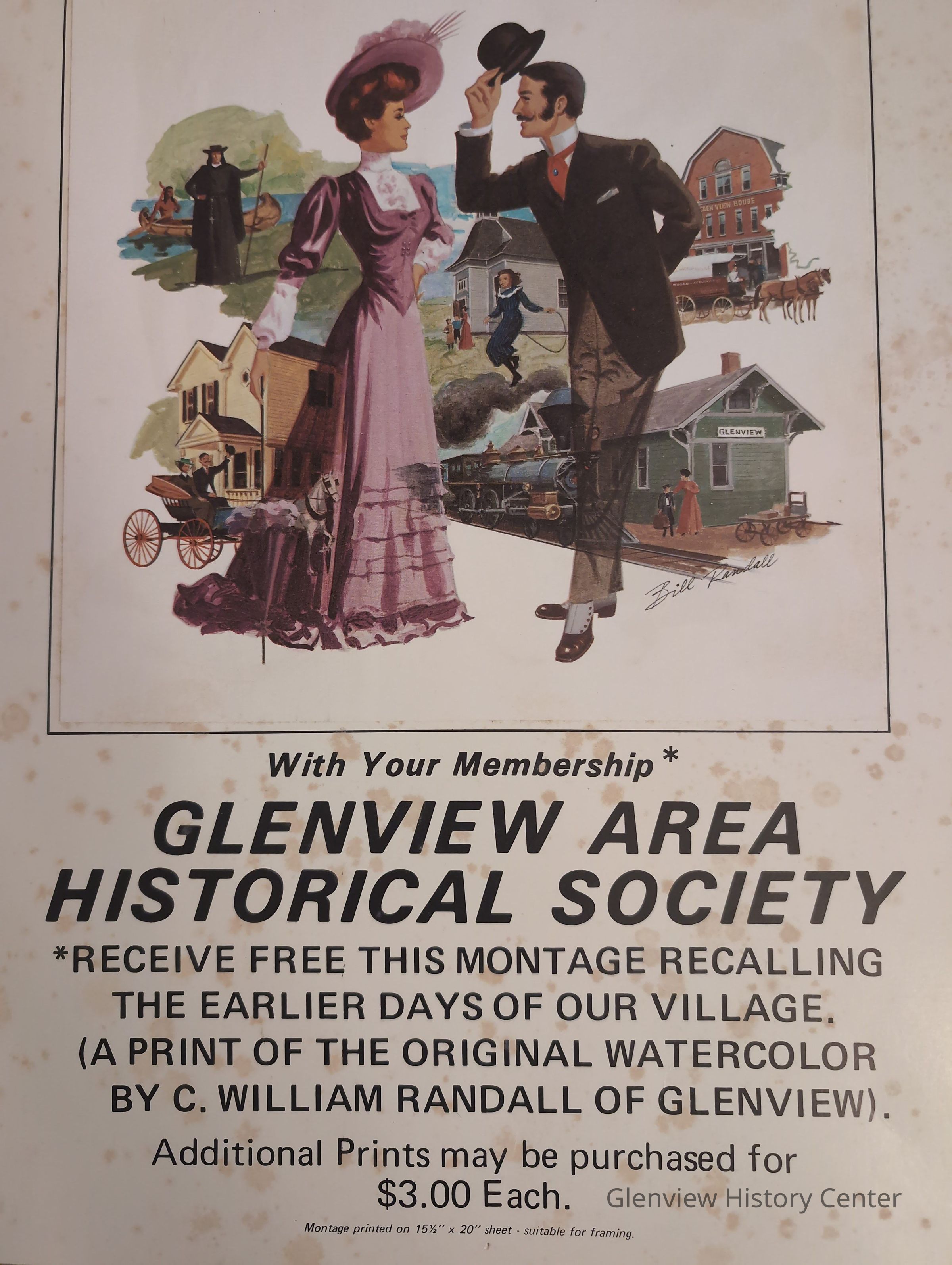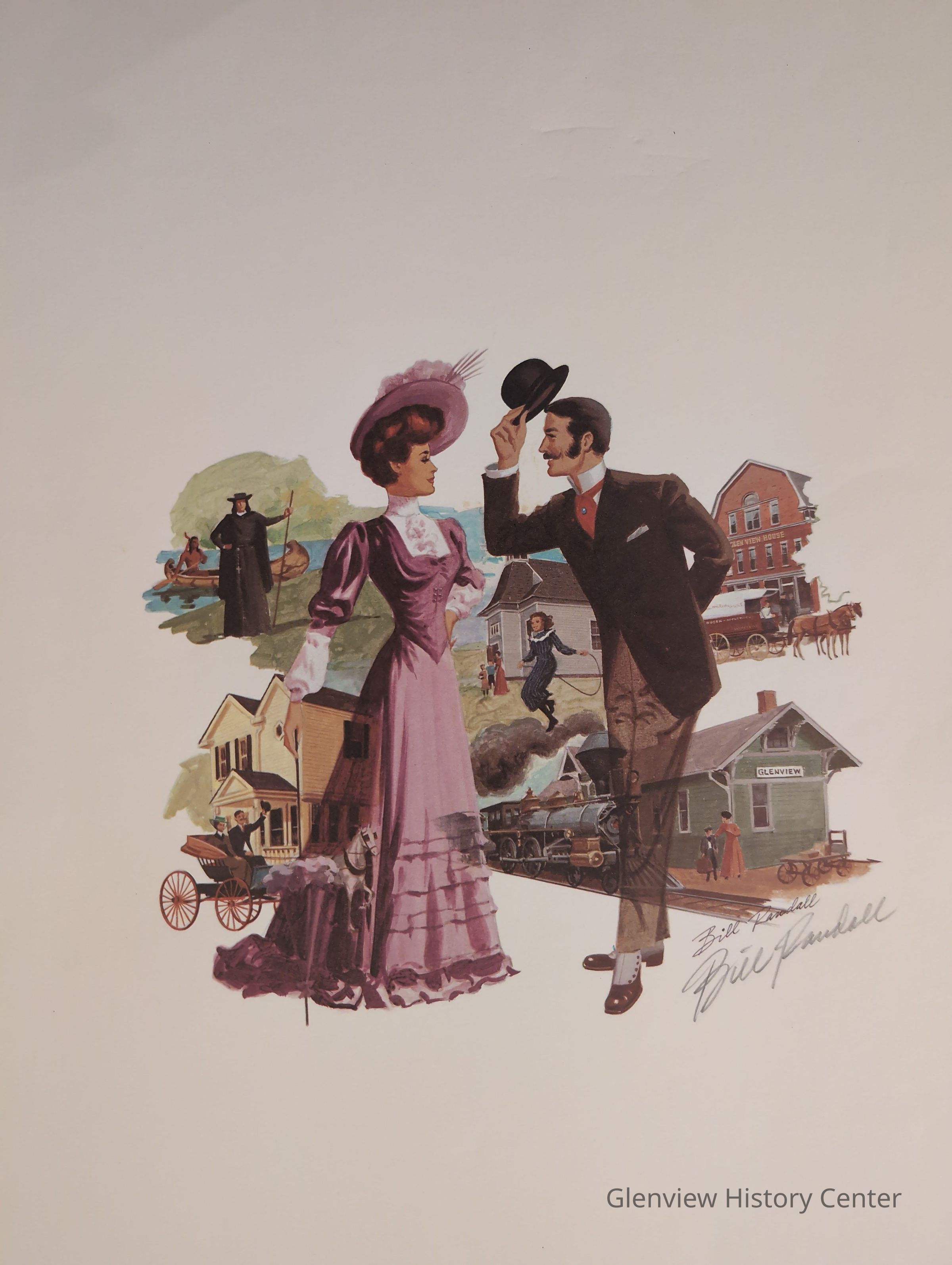 To help commemorate the Village of Glenview's 75th Birthday Celebration in 1974 an outstanding Glenview artist by the name of Bill Randall created a beautiful montage of historic local scenes. The original painting now hangs in the home of the Glenview Area Historical Society.