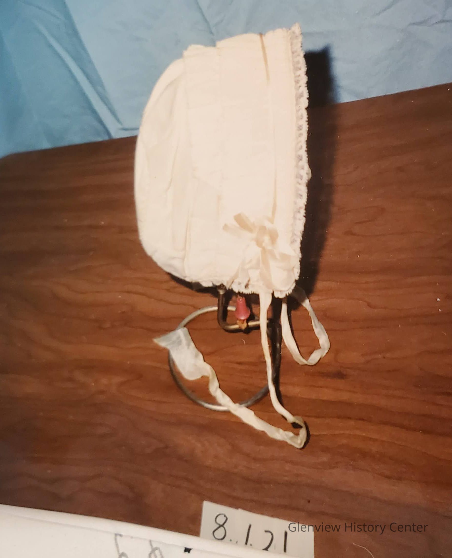 Bonnet made of grosgrain material. 2 pieces 1" gathered with lace trim - 13" and 12" ribbon ties. Ecru with silk lining.