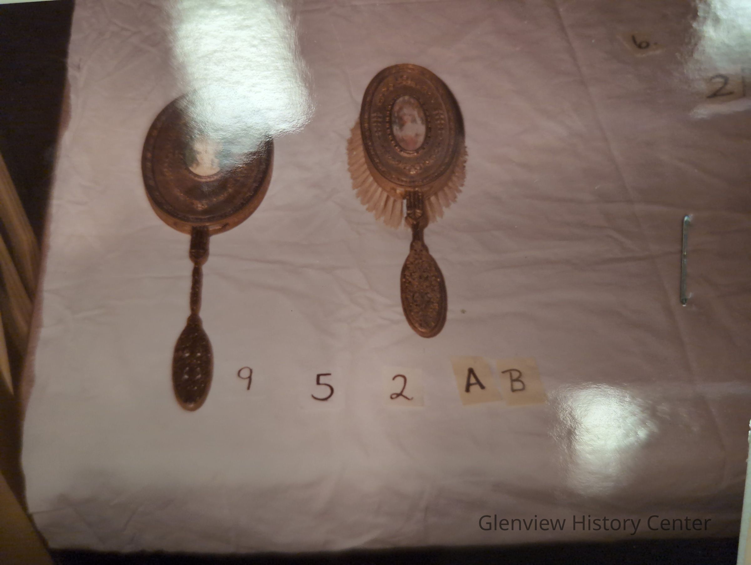 Brush and mirror set, filigree handles, mirror missing hand painted lady insert and replaced with Victorian lady's face on card; brush has insert in good condition