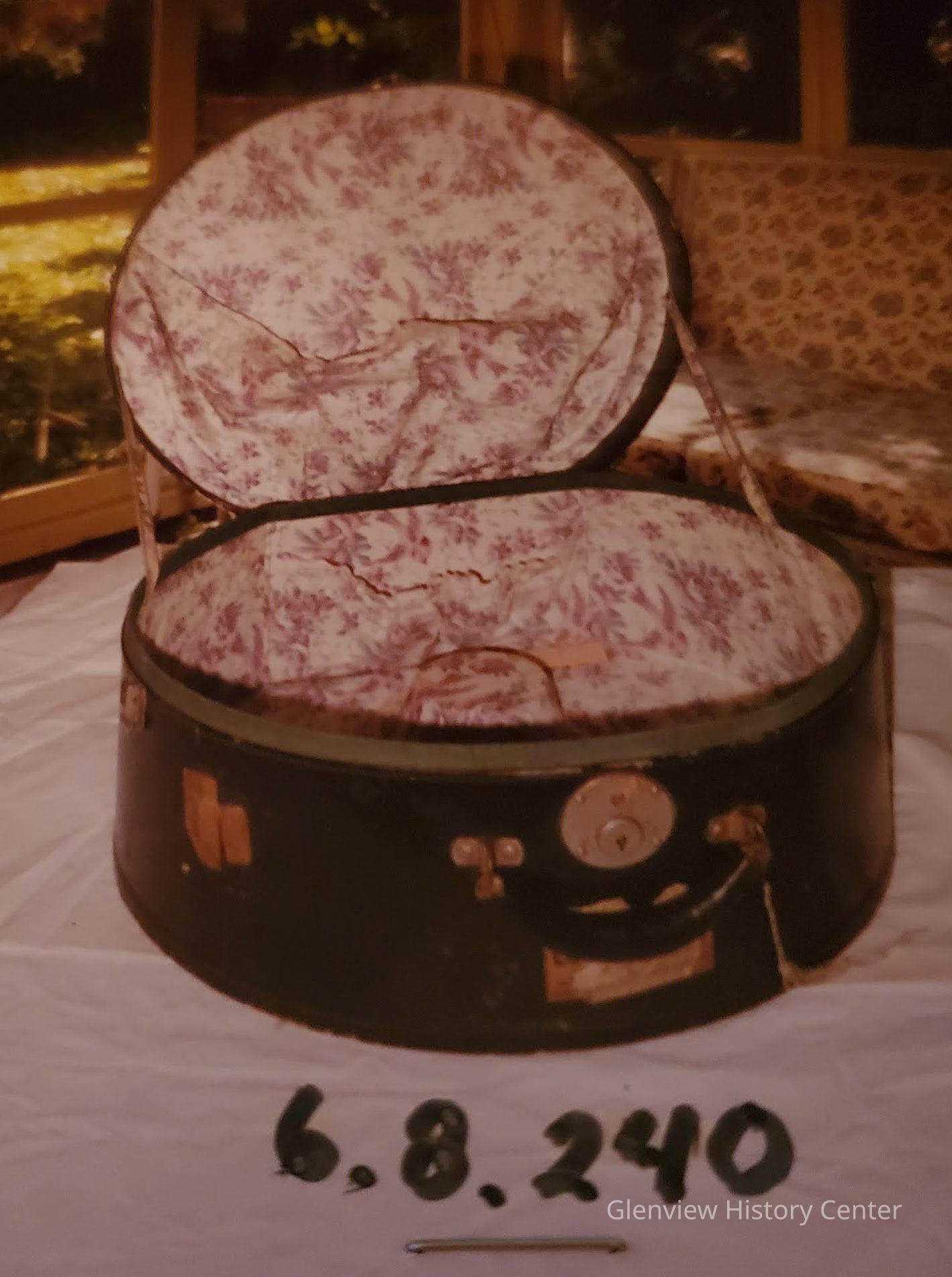 Hat box lined with floral print cotton. Has lock and key.