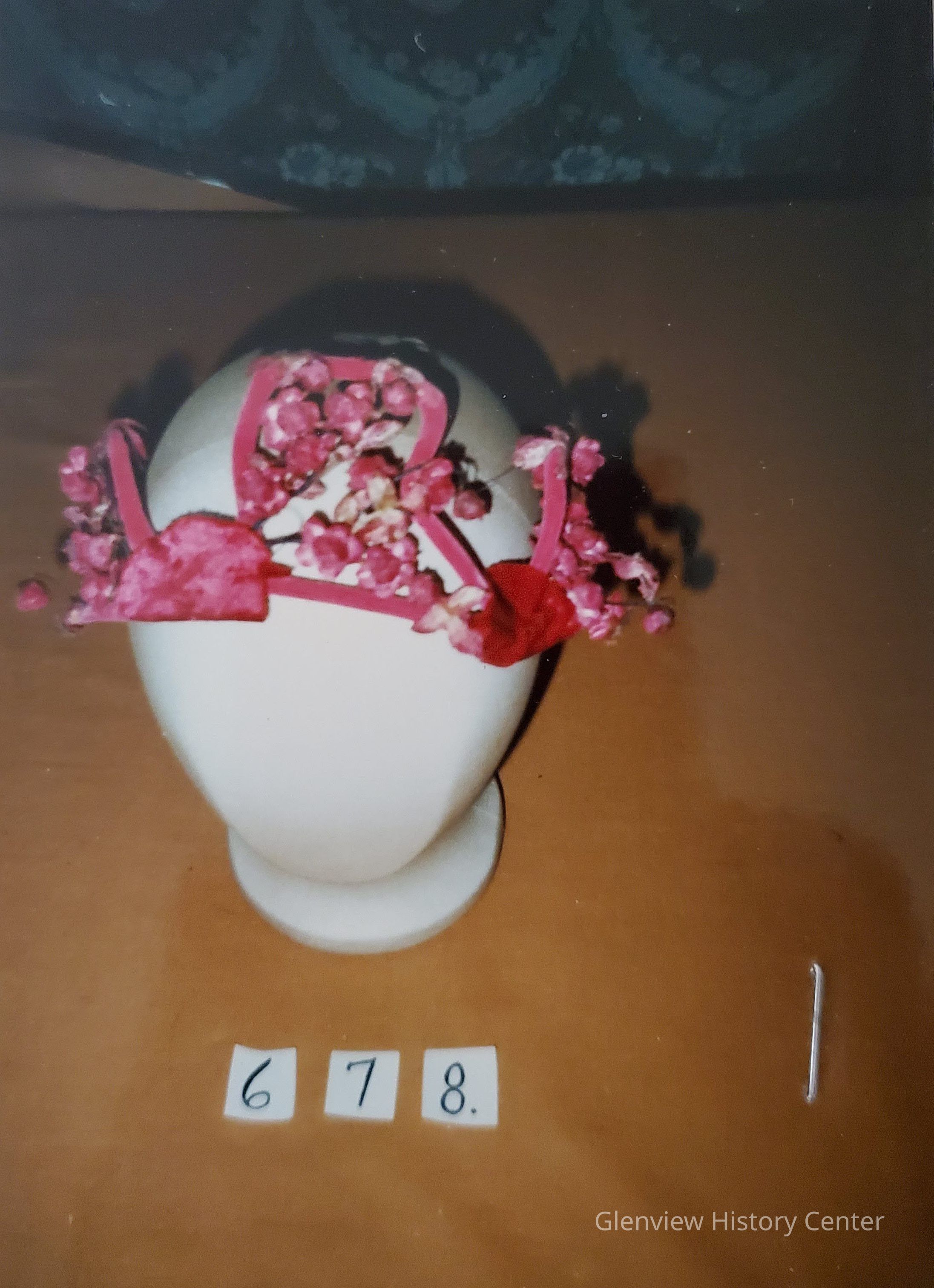 Rose Velvet on a stiffened form to fit across crown of head, decorated with flowers and leaves.