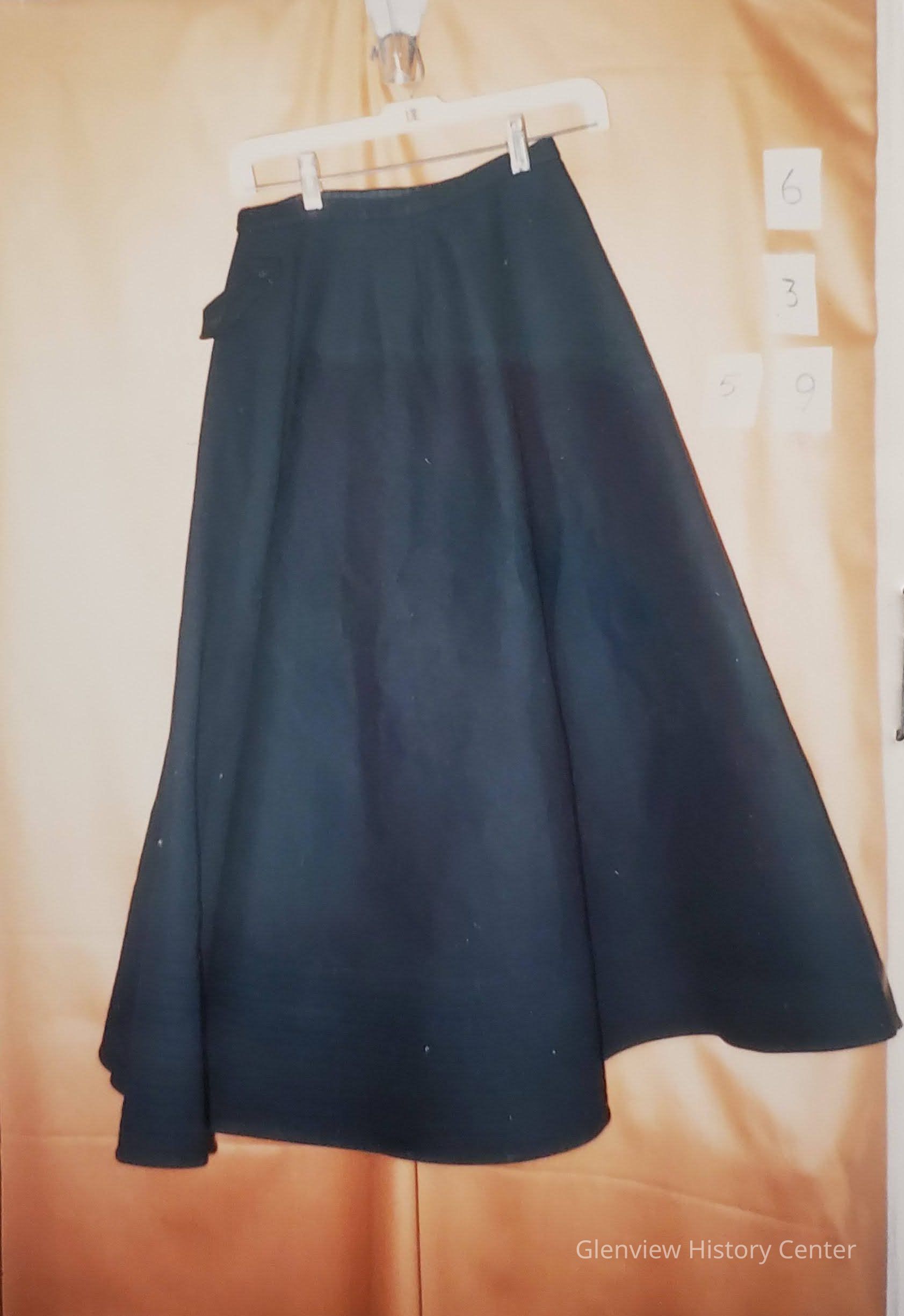 One heavy black full felt wool skirt 33" long, 72" wide at bottom and waistline 24" wide with hooks and 1 button and buttonhole. Hem at bottom 6" deep and ribbed.