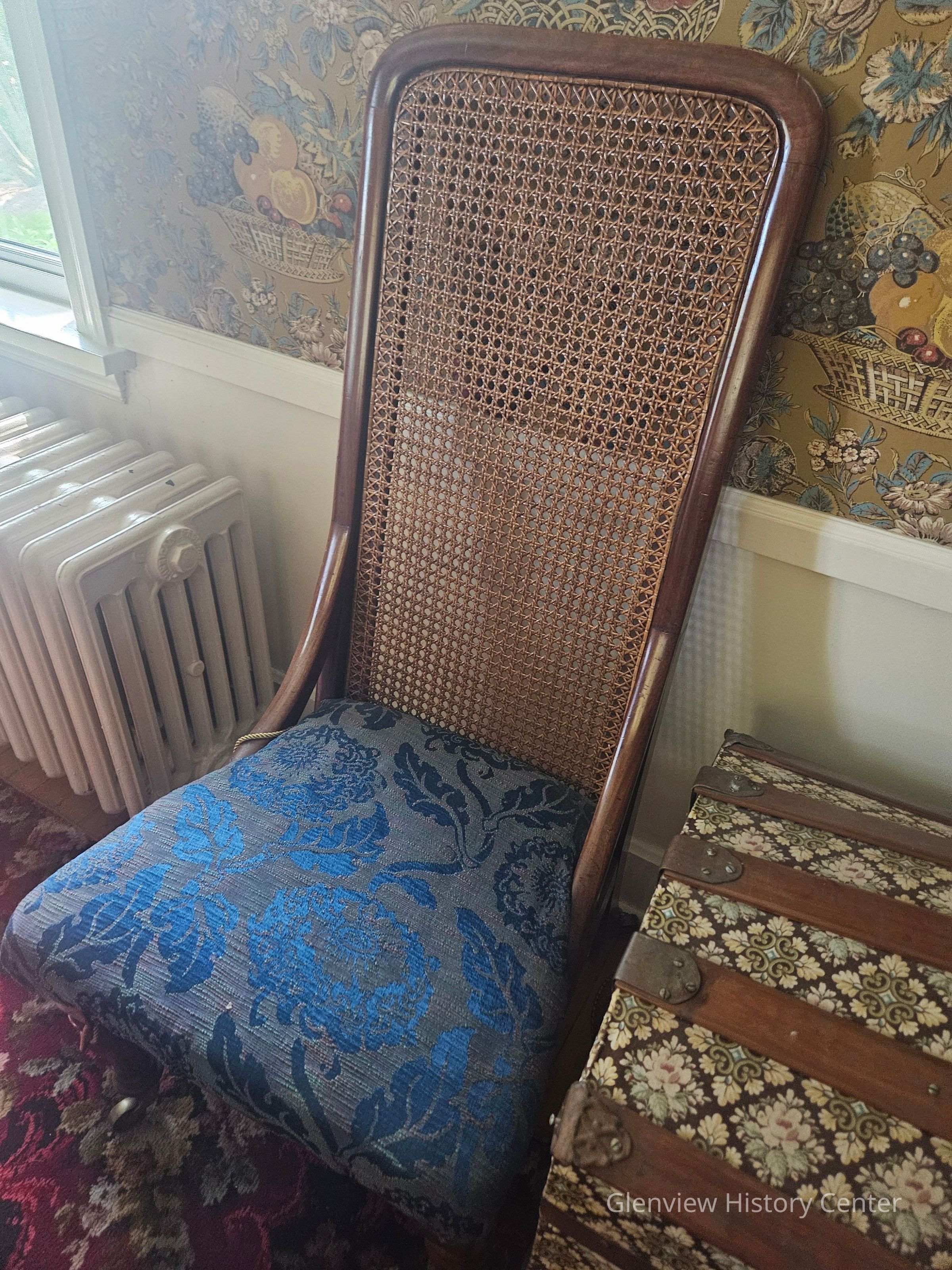 High back chair, low seat upholstered in blue damask, walnut legs and back frame, cane back