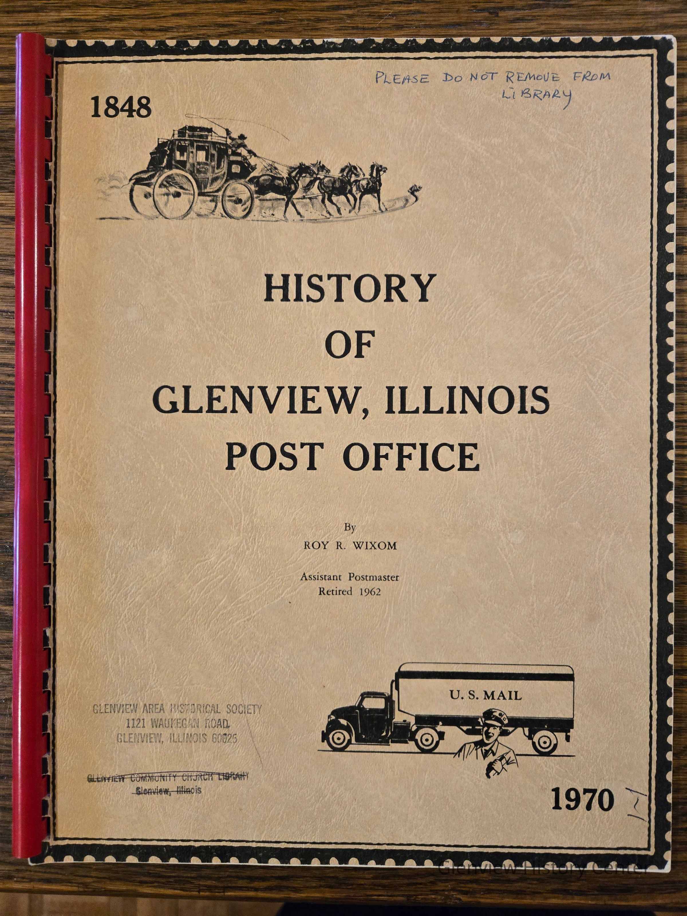 Plastic, ring-bound publication with the history of Glenview's postal area as told by author, Roy R. Wixom. Maps, photos, and notable personnel included as well as a list of previous Postmasters and their respective dates of appointment.Context