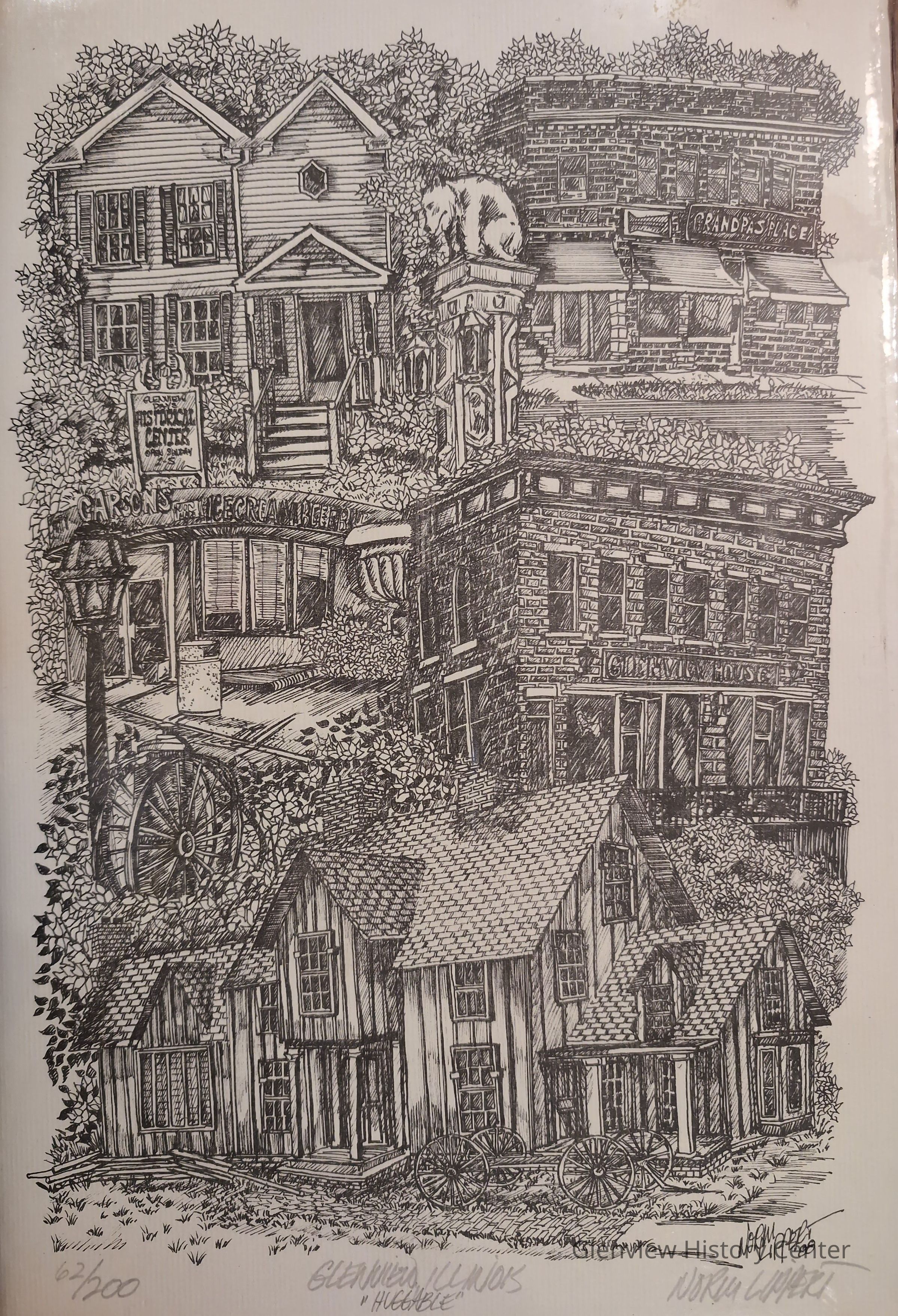 Print collage of various Glenview landmarks including: The Grove, Glenview House, Carson's Drive-in Restaurant, Grandpa's Place, the Jackman Bear, and the Glenview Historical Society