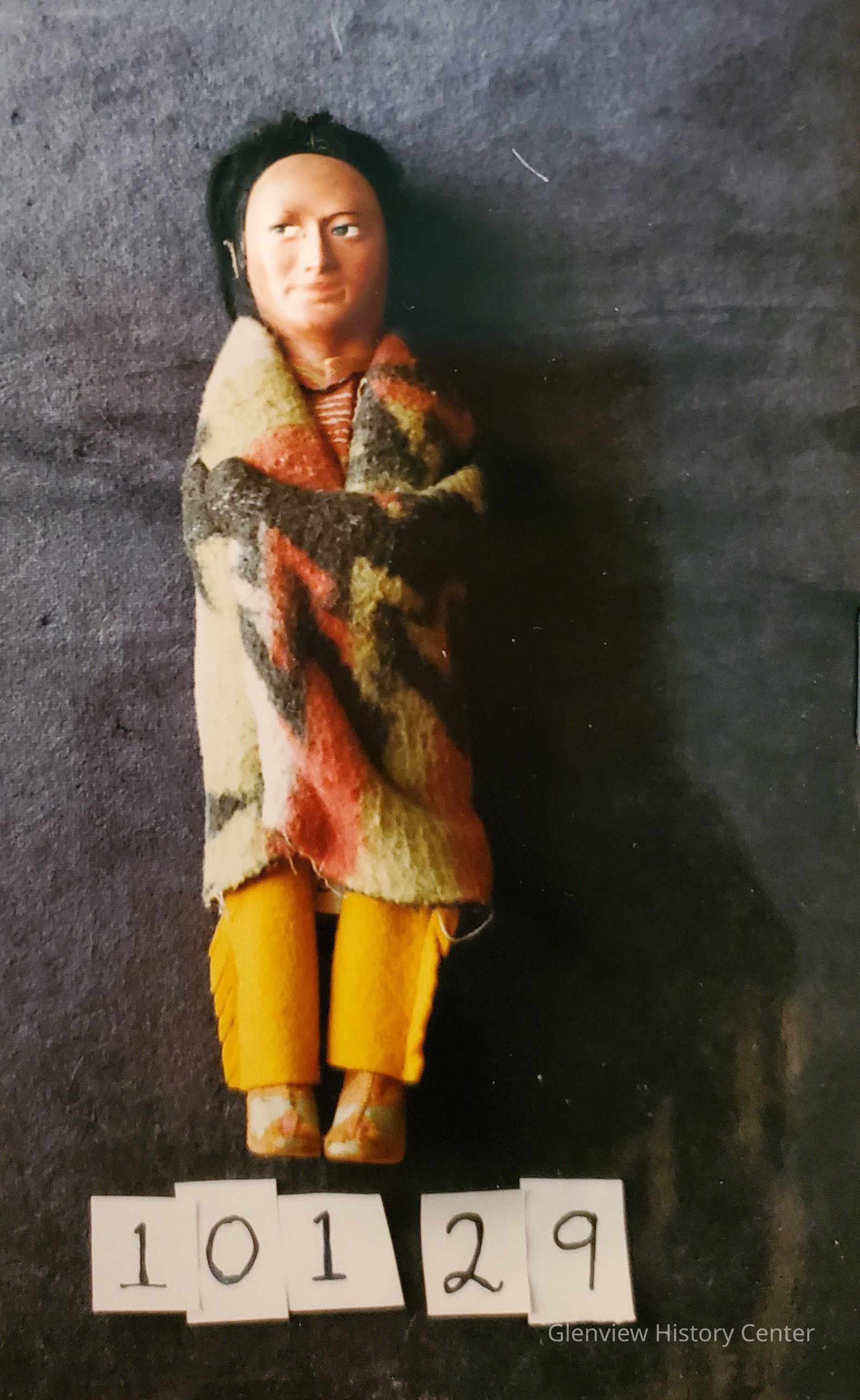 Indian brave - composition doll; hand painted face; arms are folded across chest, wrapped in Indian blanket; wool moccasins; gold felt fringed pants to look like buckskins.