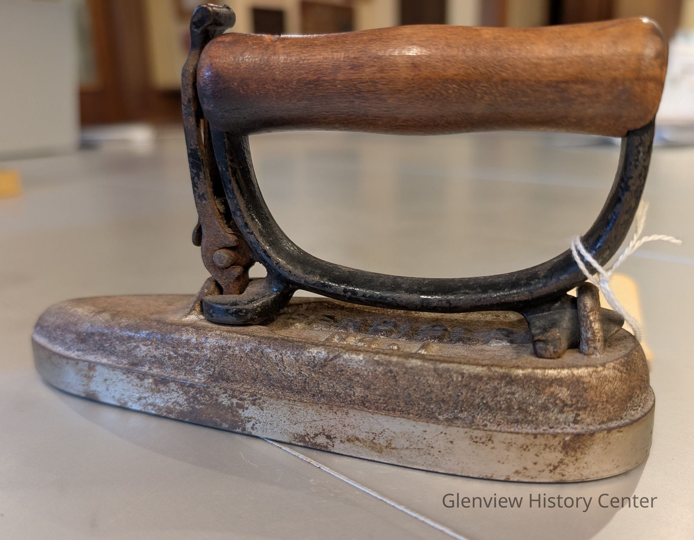 Small narrow iron for pressing sleeves with detachable wooden handle.