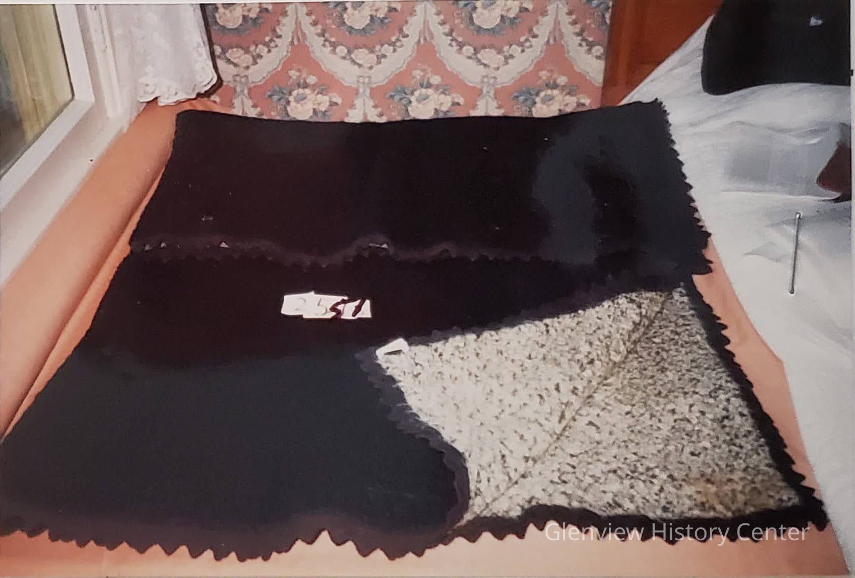 Lap robe, black wool on one side, grey black baby lamb on other side in colors of grey, black and rose, woven by an Itinerant Weaver in an and and out stitch that was also used in darning socks.Acquisition